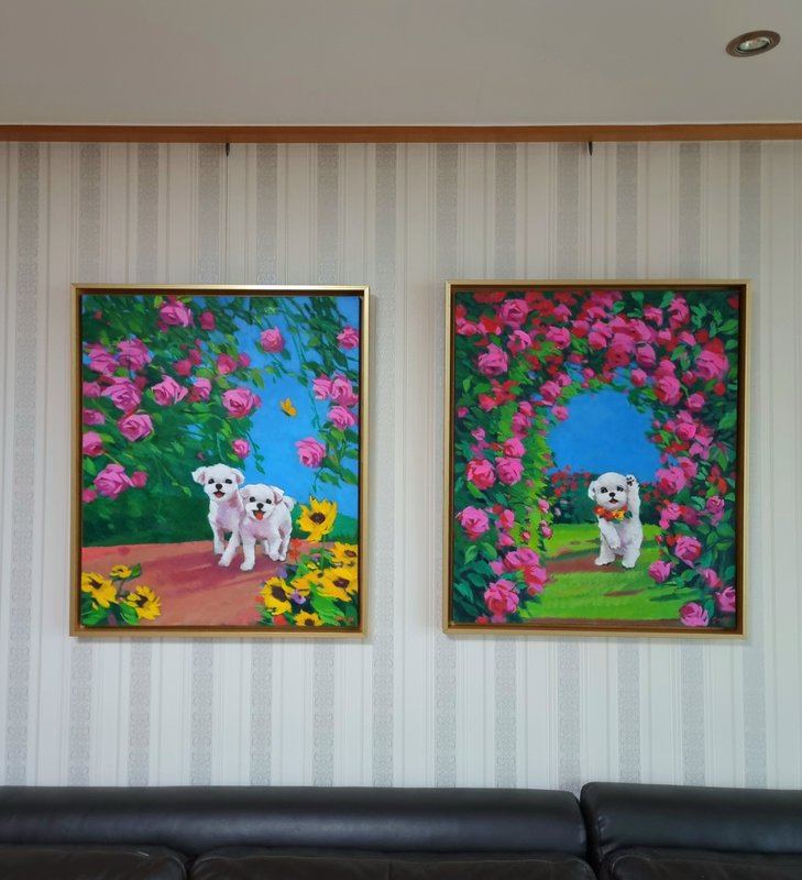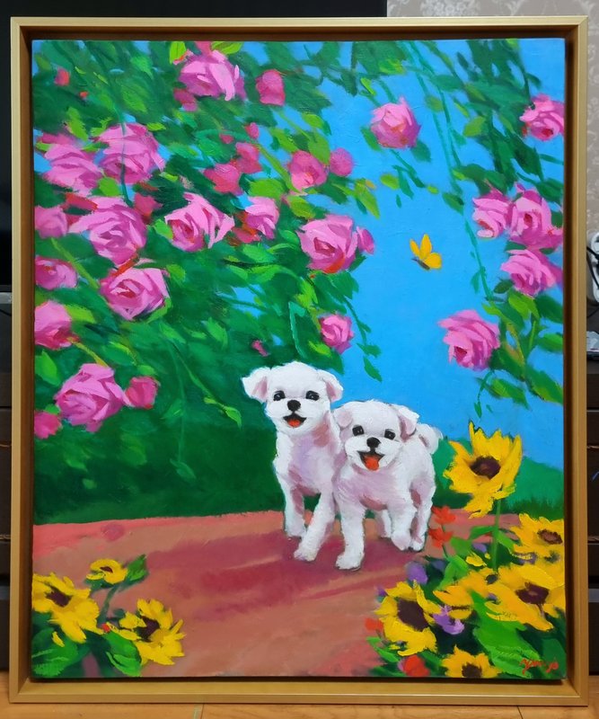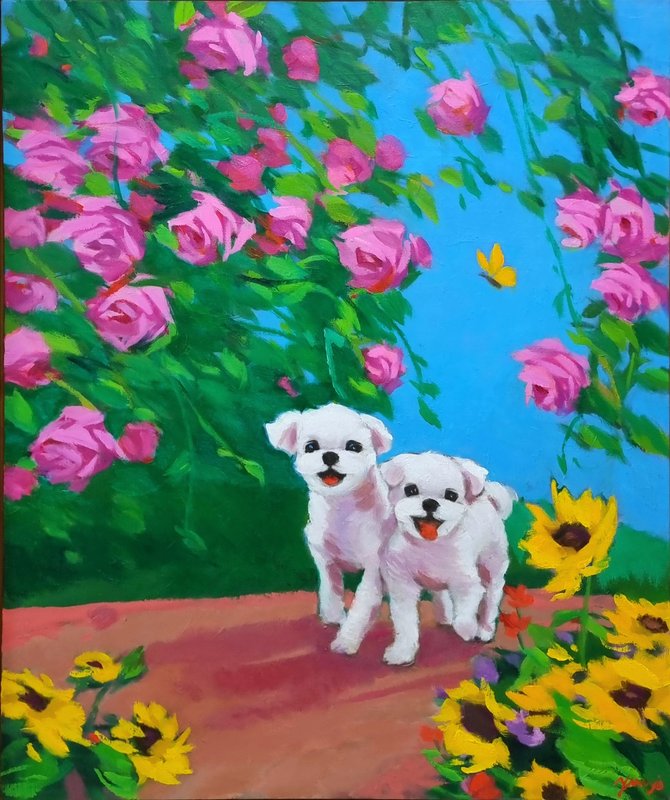 정말로 ‘행복한 마음의 정원’이 존재한다면, 그곳에는 활짝 핀 꽃들과 해맑게 웃는 강아지들이 함께할 것입니다. 박윤조 작가는 그 정원을 화폭 위에 구현하며, 우리가 그 풍경에 들어갈 수 있게 합니다. 작품 속 강아지들은 꽃을 입에 물고 산책하거나, 풍선에 매달려 하늘을 나는 등 현실과 환상의 경계를 넘나드는 연출을 구성합니다. 전통 유화 기법을 바탕으로 한 생생하고 화려한 색채와 빛의 조화는 보는 이의 감각을 깨우고, 온기를 전하는데요, 작가는 선명한 색상의 배경과 대비되는 흰색 강아지를 중심에 두어, 기쁨과 감정을 강조합니다. 이 정원은 서로를 바라보고 기대며 살아가는 우리 삶의 방식에 대한 은유입니다. 꽃과 강아지라는 상징을 통해 작가는 사랑, 위로, 동행이라는 관계의 미학을 표현하고, 평화롭고 다정한 순간들을 불러일으키며, 함께 있는 존재가 주는 온기와 따뜻한 관계들로 만들어지는 삶의 방식을 제시합니다.
