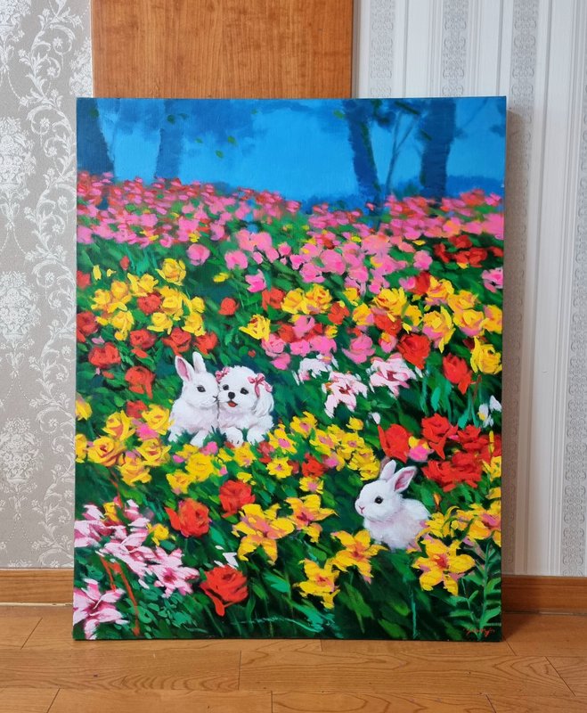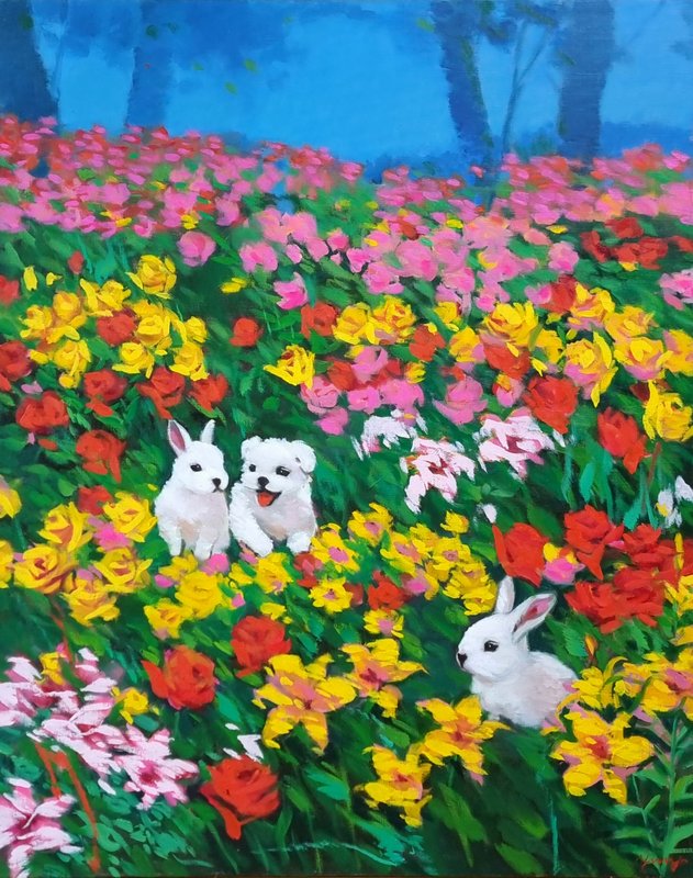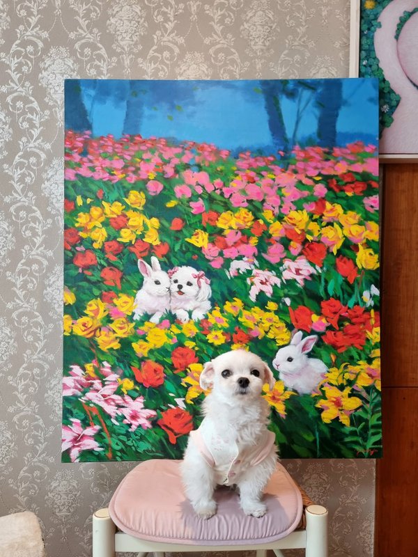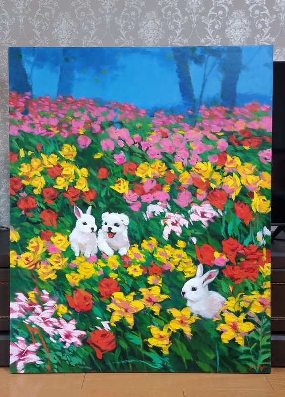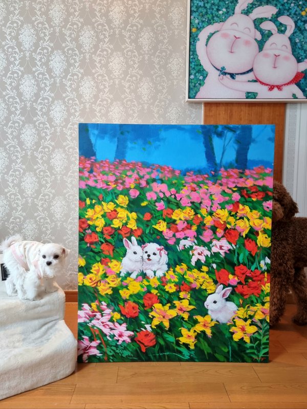 정말로 ‘행복한 마음의 정원’이 존재한다면, 그곳에는 활짝 핀 꽃들과 해맑게 웃는 강아지들이 함께할 것입니다. 박윤조 작가는 그 정원을 화폭 위에 구현하며, 우리가 그 풍경에 들어갈 수 있게 합니다. 작품 속 강아지들은 꽃을 입에 물고 산책하거나, 풍선에 매달려 하늘을 나는 등 현실과 환상의 경계를 넘나드는 연출을 구성합니다. 전통 유화 기법을 바탕으로 한 생생하고 화려한 색채와 빛의 조화는 보는 이의 감각을 깨우고, 온기를 전하는데요, 작가는 선명한 색상의 배경과 대비되는 흰색 강아지를 중심에 두어, 기쁨과 감정을 강조합니다. 이 정원은 서로를 바라보고 기대며 살아가는 우리 삶의 방식에 대한 은유입니다. 꽃과 강아지라는 상징을 통해 작가는 사랑, 위로, 동행이라는 관계의 미학을 표현하고, 평화롭고 다정한 순간들을 불러일으키며, 함께 있는 존재가 주는 온기와 따뜻한 관계들로 만들어지는 삶의 방식을 제시합니다.