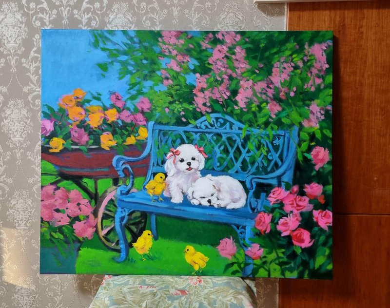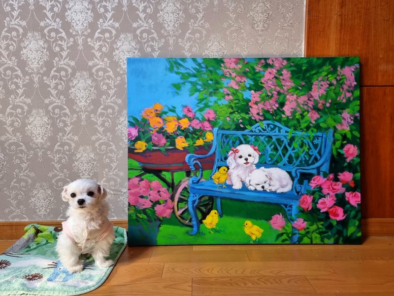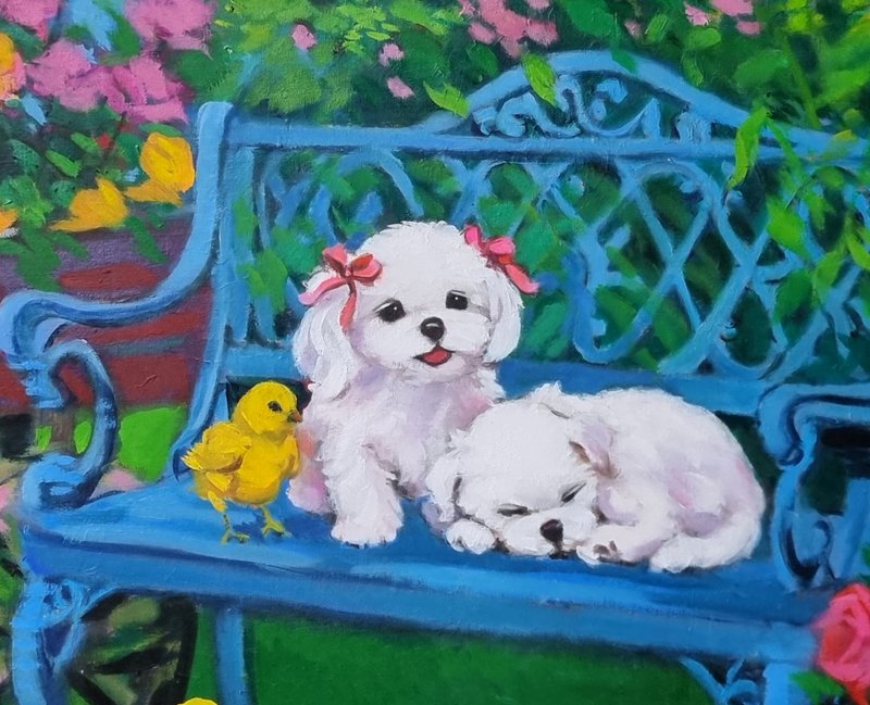정말로 ‘행복한 마음의 정원’이 존재한다면, 그곳에는 활짝 핀 꽃들과 해맑게 웃는 강아지들이 함께할 것입니다. 박윤조 작가는 그 정원을 화폭 위에 구현하며, 우리가 그 풍경에 들어갈 수 있게 합니다. 작품 속 강아지들은 꽃을 입에 물고 산책하거나, 풍선에 매달려 하늘을 나는 등 현실과 환상의 경계를 넘나드는 연출을 구성합니다. 전통 유화 기법을 바탕으로 한 생생하고 화려한 색채와 빛의 조화는 보는 이의 감각을 깨우고, 온기를 전하는데요, 작가는 선명한 색상의 배경과 대비되는 흰색 강아지를 중심에 두어, 기쁨과 감정을 강조합니다. 이 정원은 서로를 바라보고 기대며 살아가는 우리 삶의 방식에 대한 은유입니다. 꽃과 강아지라는 상징을 통해 작가는 사랑, 위로, 동행이라는 관계의 미학을 표현하고, 평화롭고 다정한 순간들을 불러일으키며, 함께 있는 존재가 주는 온기와 따뜻한 관계들로 만들어지는 삶의 방식을 제시합니다.