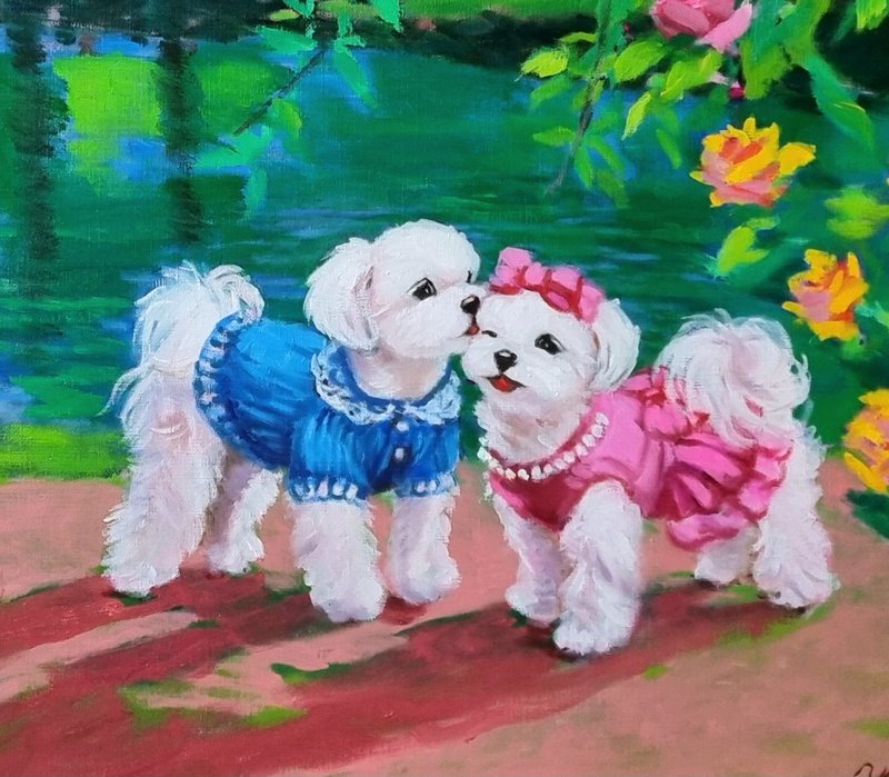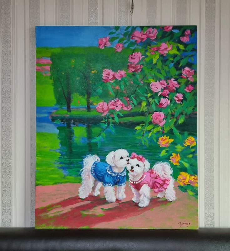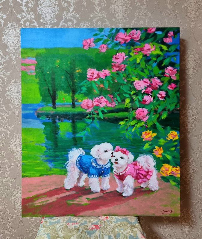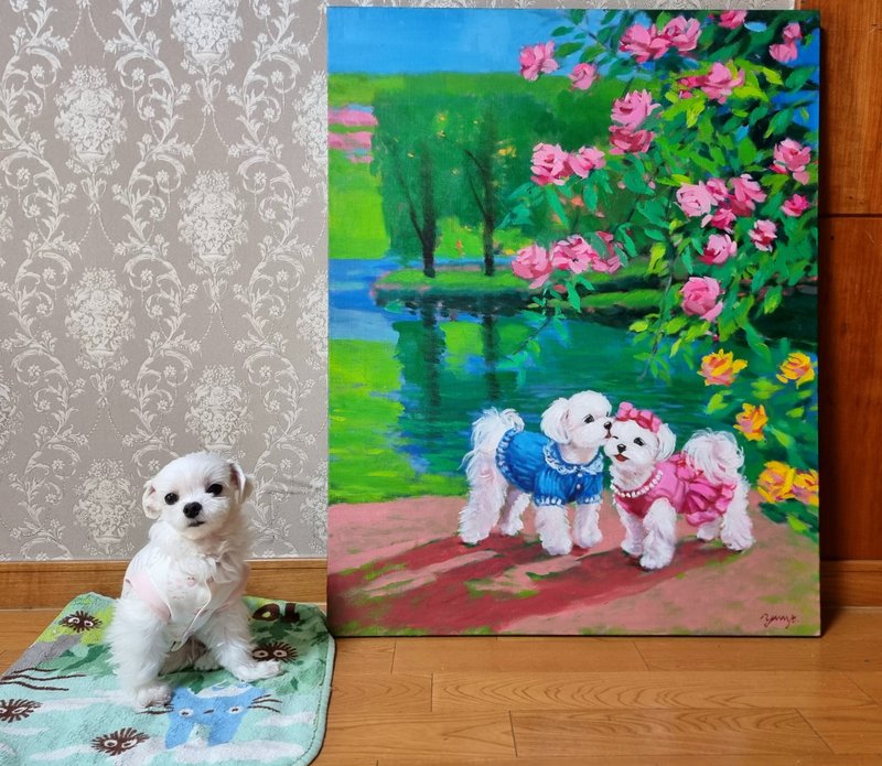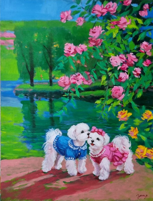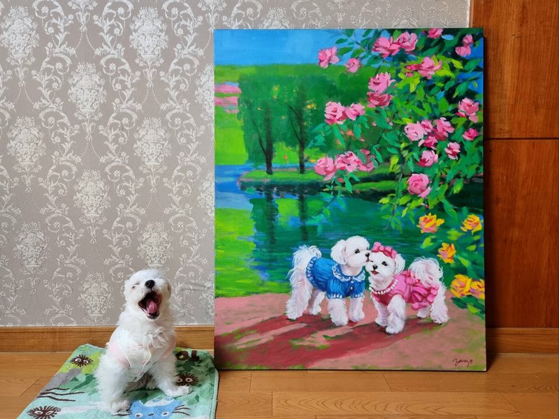 정말로 ‘행복한 마음의 정원’이 존재한다면, 그곳에는 활짝 핀 꽃들과 해맑게 웃는 강아지들이 함께할 것입니다. 박윤조 작가는 그 정원을 화폭 위에 구현하며, 우리가 그 풍경에 들어갈 수 있게 합니다. 작품 속 강아지들은 꽃을 입에 물고 산책하거나, 풍선에 매달려 하늘을 나는 등 현실과 환상의 경계를 넘나드는 연출을 구성합니다. 전통 유화 기법을 바탕으로 한 생생하고 화려한 색채와 빛의 조화는 보는 이의 감각을 깨우고, 온기를 전하는데요, 작가는 선명한 색상의 배경과 대비되는 흰색 강아지를 중심에 두어, 기쁨과 감정을 강조합니다. 이 정원은 서로를 바라보고 기대며 살아가는 우리 삶의 방식에 대한 은유입니다. 꽃과 강아지라는 상징을 통해 작가는 사랑, 위로, 동행이라는 관계의 미학을 표현하고, 평화롭고 다정한 순간들을 불러일으키며, 함께 있는 존재가 주는 온기와 따뜻한 관계들로 만들어지는 삶의 방식을 제시합니다.
