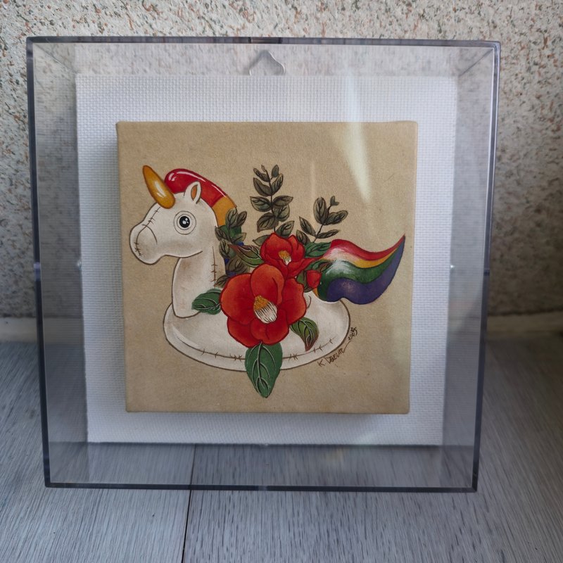'Comma' 시리즈에 등장하는 유니콘 튜브는 작가 자신이자, 지금을 살아가는 우리의 모습입니다. 바람 빠진 튜브처럼 가라앉기도 하고, 다시 숨을 불어넣으며 조금씩 회복해 나가기도 하는 우리 처럼 말입니다. 김다은 작가는 삶의 복잡한 장면들 속에서 ‘쉼’을 그려내는 작업을 통해, 연약함조차도 삶의 일부로 포용하는 풍경을 제시합니다. 작품 속 튜브는 식물, 기억, 사물, 상상 속 풍경과 함께 머뭅니다. 선인장처럼 거친 환경에서도 버텨내는 강인함, 수국처럼 유연하게 색을 바꾸는 적응력, 프리지아의 빛나는 감정과 같이 각기 다른 정서를 담은 식물은 관람자의 마음을 대변합니다. 특히 작가는 오래된 액자 속의 풍경인 정글의 호수, 수박 수영장, 바다로 향하는 기차를 그려냅니다. 이 장면들은 현실과 비현실 사이에 누구에게나 존재했지만 잊고 지낸 마음의 피난처를 상기시킵니다. 그림 속 풍경을 마주한 순간, 당신의 마음에도 조용한 숨 하나가 놓이기를 바랍니다.