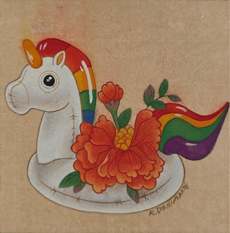 여러분은 사진을 찍고 며칠을 기다린 끝에 받아본 적이 있나요? 결과물이 어떻게 나올지 전혀 모르는 상태에서 기다리는 마음은, 우리의 추억을 곱씹고 되돌아보게 합니다. 김다은 작가의 ‘Analog’ 시리즈는 그렇게 잊히는 일상에서 느낄 수 있는 소중함에 대해 말합니다. 어느 시절을 향한 향수에 대한 작업이기보다는, 지금 우리에게 필요한 속도에 관해 깊이 사유합니다. 꽃은 급히 피어나지 않습니다. 계절을 견디고 기다림의 시간을 거친 후에야, 비로소 피어납니다. 작가의 그림 속 아날로그 기기들과 함께 놓여 있는 꽃들은 같은 속도로 우리 삶 속의 느린 감정과 닮았습니다. 이 시리즈는 결국 우리가 잃어가던 정서적 시간을 회복하자는 뜻을 전합니다. 오랜 세월 함께한 기계에 마음을 주듯, 힘든 하루를 보내고 녹이 슬어버린 기계와도 같은 나 자신을 위로해 주는 작업이 되기를 바랍니다.