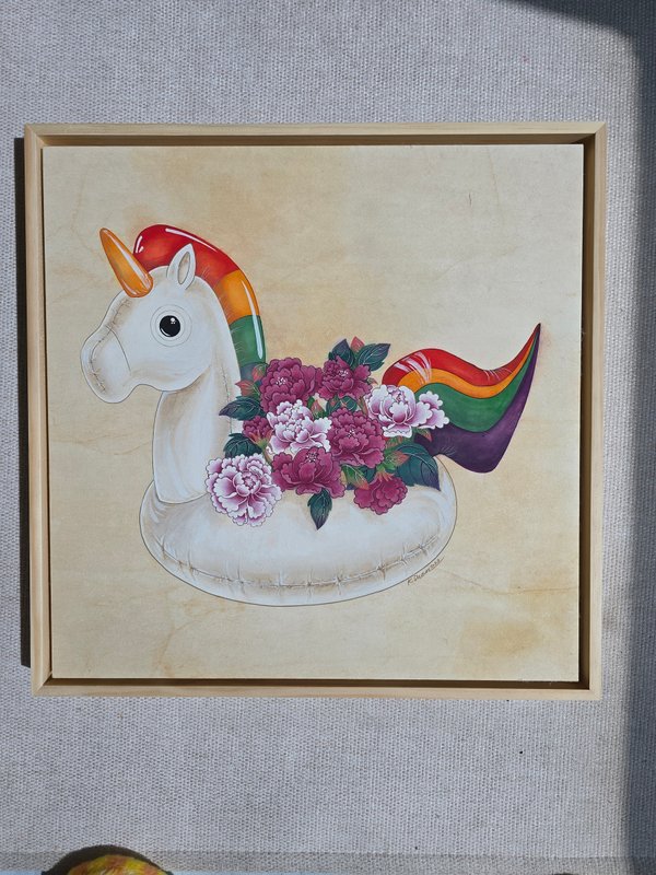 'Comma' 시리즈에 등장하는 유니콘 튜브는 작가 자신이자, 지금을 살아가는 우리의 모습입니다. 바람 빠진 튜브처럼 가라앉기도 하고, 다시 숨을 불어넣으며 조금씩 회복해 나가기도 하는 우리 처럼 말입니다. 김다은 작가는 삶의 복잡한 장면들 속에서 ‘쉼’을 그려내는 작업을 통해, 연약함조차도 삶의 일부로 포용하는 풍경을 제시합니다. 작품 속 튜브는 식물, 기억, 사물, 상상 속 풍경과 함께 머뭅니다. 선인장처럼 거친 환경에서도 버텨내는 강인함, 수국처럼 유연하게 색을 바꾸는 적응력, 프리지아의 빛나는 감정과 같이 각기 다른 정서를 담은 식물은 관람자의 마음을 대변합니다. 특히 작가는 오래된 액자 속의 풍경인 정글의 호수, 수박 수영장, 바다로 향하는 기차를 그려냅니다. 이 장면들은 현실과 비현실 사이에 누구에게나 존재했지만 잊고 지낸 마음의 피난처를 상기시킵니다. 그림 속 풍경을 마주한 순간, 당신의 마음에도 조용한 숨 하나가 놓이기를 바랍니다.