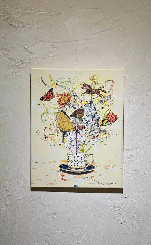누군가를 만나 커피 한잔을 하며 이야기를 나누듯, 작품 속 커피잔에 담긴 이야기를 상상해 보며 누군가와 함께 대화를 나눠보는 것 어떠실까요? 작품 속 커피잔과 연결된 열기구는 마치 하늘에서 땅으로 커피를 내려주는 이상적인 커피 머신과도 같아 보입니다. 후안리킴 작가는 일상에서 친근한 소재와 걸맞지 않은 상상의 세계를 결합시켜 신비롭고 독특한 작품 세계를 보여줍니다. 이로 인해 감상자에게 좀 더 친숙한 방식으로 작가의 이상적인 세계를 구현합니다. 작가는 꽃과 나비, 로봇 등과 같이 쉽게 상상할 수 없는 대상을 조합해 삶과 이상이 만나는 지점을 만들고, 동화 같은 이야기 속으로 감상자를 인도합니다. 부조리하고 악한 존재에 맞서며 결국에는 거짓 없는 진실이 이긴다는 메시지를 담은 작가의 이야기 속으로 빠져보시기를 바랍니다.