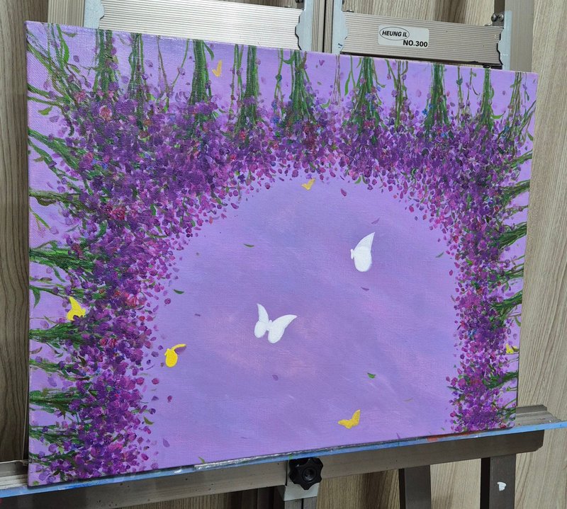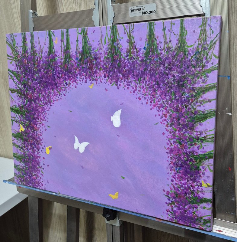 꽃내음 물씬 나는 풍경화의 세계로 여러분을 초대합니다. 작가의 작품을 바라보면 마치 봄바람에 꽃잎이 흩날리는 듯한 느낌을 받을 수 있는데요. 꽃과 나비가 어우러지는 장면은 봄의 생동감을 그대로 전해줍니다. 또한 밝은 색조와 흐릿한 배경이 꿈결 같은 몽환적인 분위기를 자아내며, 자연의 아름다움을 따뜻하고 부드럽게 전해줍니다. 작가는 대상에 대한 정교한 묘사와 함께, 작품 전체를 아우르는 따뜻한 색감을 활용하여 자연 속에 머무는 소중한 일상의 순간을 담아냅니다.