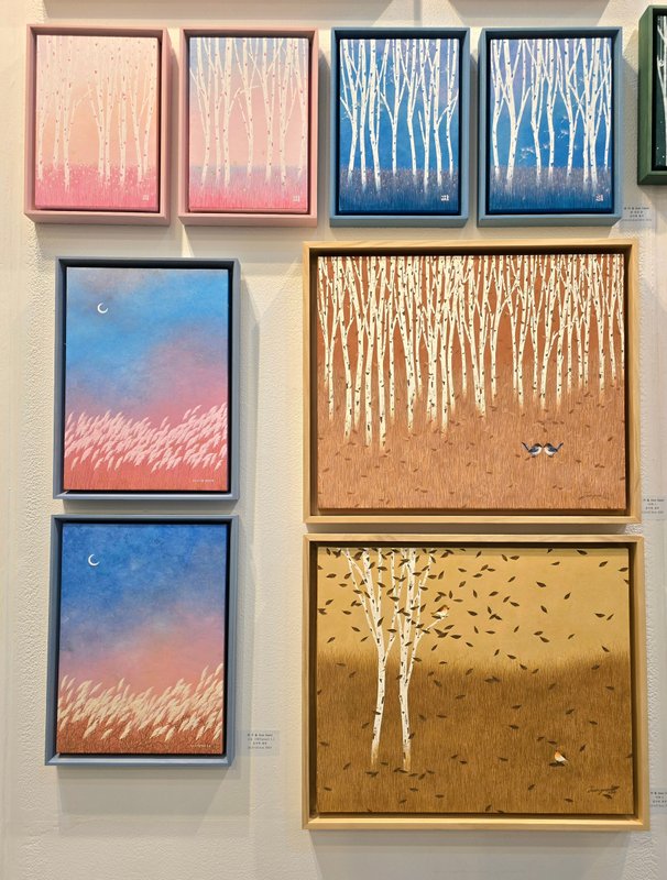 작가는 행복이란 과거나 미래에 있는 것이 아니라, 바로 여기, 지금 이 순간에 있다고 말합니다. 그는 따스한 바람과 길가에 핀 예쁜 꽃을 보며 평화로움을 느끼는 봄, 시원한 아이스 아메리카노와 맥주 한 잔에 기쁨을 느끼는 여름, 높고 푸른 하늘과 단풍이 어우러지는 가을, 크리스마스와 첫눈을 기다리며 설레는 겨울 등, 흘러가는 계절 속에서 행복을 찾습니다. 매 순간을 소중히 들여다보고 그려내는 작가의 따스한 시선은 작품 속 작은 동물, 휘날리는 잎, 반짝이는 별 등을 통해 엿볼 수 있습니다. 피곤하고 힘든 하루의 끝을 작가의 작품을 감상하며 기분 좋게 마무리하는 것은 어떠실까요?