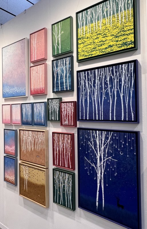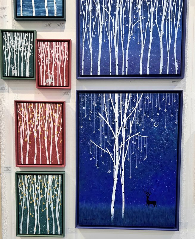 작가는 행복이란 과거나 미래에 있는 것이 아니라, 바로 여기, 지금 이 순간에 있다고 말합니다. 그는 따스한 바람과 길가에 핀 예쁜 꽃을 보며 평화로움을 느끼는 봄, 시원한 아이스 아메리카노와 맥주 한 잔에 기쁨을 느끼는 여름, 높고 푸른 하늘과 단풍이 어우러지는 가을, 크리스마스와 첫눈을 기다리며 설레는 겨울 등, 흘러가는 계절 속에서 행복을 찾습니다. 매 순간을 소중히 들여다보고 그려내는 작가의 따스한 시선은 작품 속 작은 동물, 휘날리는 잎, 반짝이는 별 등을 통해 엿볼 수 있습니다. 피곤하고 힘든 하루의 끝을 작가의 작품을 감상하며 기분 좋게 마무리하는 것은 어떠실까요?