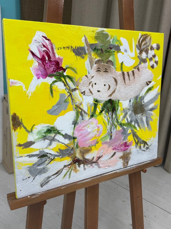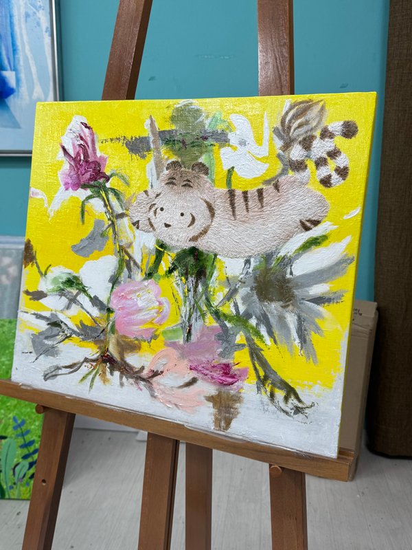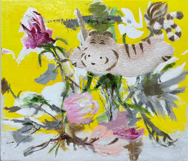 어릴 적 한 번쯤은 아무 걱정 없이 뛰놀던 숲을 기억하시나요? 끝없이 펼쳐진 나뭇잎 사이를 가르고, 이름 모를 꽃과 풀들 사이를 달리던 그 순간을요. 이은희 작가의 작품은 그 숲을 다시 기억할 수 있도록 유도합니다. 자연의 흐름을 따라 무심히 뿌려진 물감, 흘러내리고 겹쳐진 색들은 마치 바람을 따라 흔들리는 풀잎처럼 자유롭습니다. 그 위를 가볍게 뛰노는 아기 호랑이는 우리 마음 깊은 곳에 숨어 있던 천진난만한 자아를 일깨워 줍니다. 작가는 스케치조차 없이 캔버스에 물감을 붓고 문지르며, 자연처럼 예측할 수 없는 흐름을 만들어냅니다. 흔적들이 쌓이고 사라지며 완성된 화면은 어릴 적 우리가 무심히 뛰어다녔던 순간들처럼 자유롭고 솔직합니다. 구상과 추상이 조화롭게 뒤섞여 따뜻한 분위기를 자아내는 이은희 작가의 작품은 우리의 순수함을 떠올리게 합니다. 작품 앞에 잠시 멈춰 서서 작은 호랑이를 따라 숲을 날아다니듯, 마음 한 켠에 여전히 살아 있는 천진함을 만나보세요.