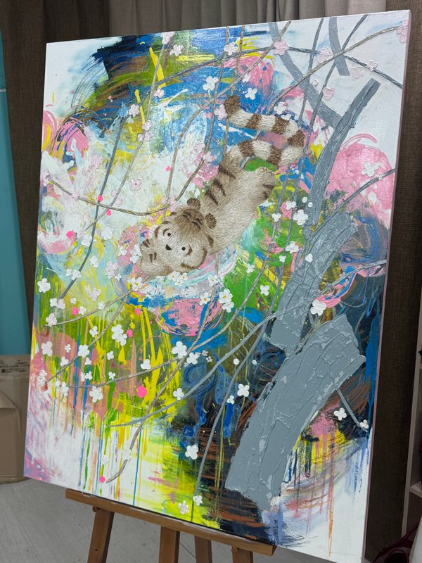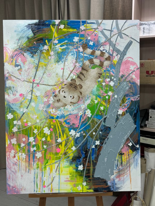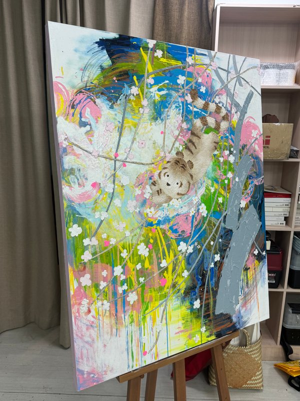 어릴 적 한 번쯤은 아무 걱정 없이 뛰놀던 숲을 기억하시나요? 끝없이 펼쳐진 나뭇잎 사이를 가르고, 이름 모를 꽃과 풀들 사이를 달리던 그 순간을요. 이은희 작가의 작품은 그 숲을 다시 기억할 수 있도록 유도합니다. 자연의 흐름을 따라 무심히 뿌려진 물감, 흘러내리고 겹쳐진 색들은 마치 바람을 따라 흔들리는 풀잎처럼 자유롭습니다. 그 위를 가볍게 뛰노는 아기 호랑이는 우리 마음 깊은 곳에 숨어 있던 천진난만한 자아를 일깨워 줍니다. 작가는 스케치조차 없이 캔버스에 물감을 붓고 문지르며, 자연처럼 예측할 수 없는 흐름을 만들어냅니다. 흔적들이 쌓이고 사라지며 완성된 화면은 어릴 적 우리가 무심히 뛰어다녔던 순간들처럼 자유롭고 솔직합니다. 구상과 추상이 조화롭게 뒤섞여 따뜻한 분위기를 자아내는 이은희 작가의 작품은 우리의 순수함을 떠올리게 합니다. 작품 앞에 잠시 멈춰 서서 작은 호랑이를 따라 숲을 날아다니듯, 마음 한 켠에 여전히 살아 있는 천진함을 만나보세요.