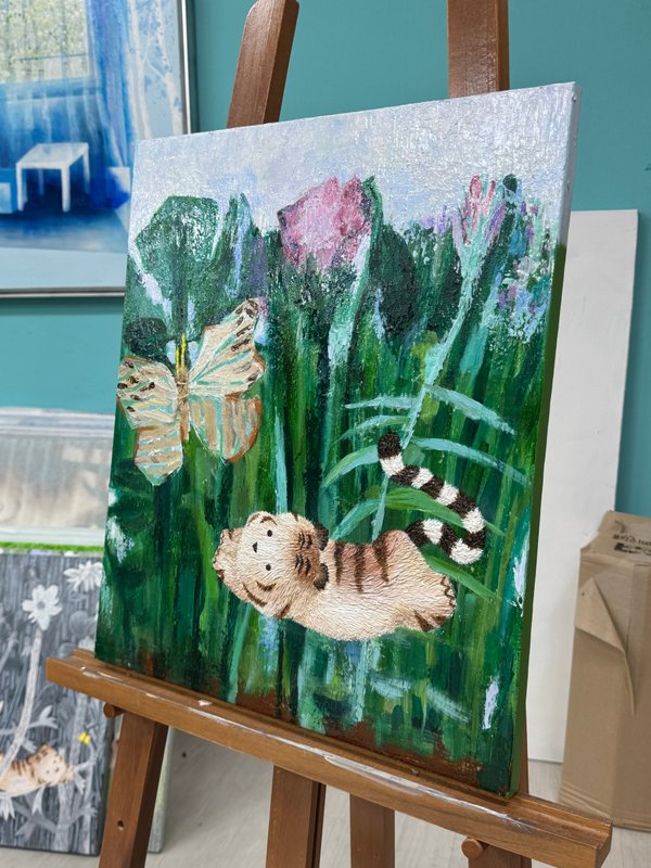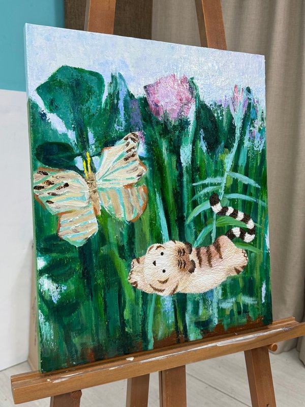 어릴 적 한 번쯤은 아무 걱정 없이 뛰놀던 숲을 기억하시나요? 끝없이 펼쳐진 나뭇잎 사이를 가르고, 이름 모를 꽃과 풀들 사이를 달리던 그 순간을요. 이은희 작가의 작품은 그 숲을 다시 기억할 수 있도록 유도합니다. 자연의 흐름을 따라 무심히 뿌려진 물감, 흘러내리고 겹쳐진 색들은 마치 바람을 따라 흔들리는 풀잎처럼 자유롭습니다. 그 위를 가볍게 뛰노는 아기 호랑이는 우리 마음 깊은 곳에 숨어 있던 천진난만한 자아를 일깨워 줍니다. 작가는 스케치조차 없이 캔버스에 물감을 붓고 문지르며, 자연처럼 예측할 수 없는 흐름을 만들어냅니다. 흔적들이 쌓이고 사라지며 완성된 화면은 어릴 적 우리가 무심히 뛰어다녔던 순간들처럼 자유롭고 솔직합니다. 구상과 추상이 조화롭게 뒤섞여 따뜻한 분위기를 자아내는 이은희 작가의 작품은 우리의 순수함을 떠올리게 합니다. 작품 앞에 잠시 멈춰 서서 작은 호랑이를 따라 숲을 날아다니듯, 마음 한 켠에 여전히 살아 있는 천진함을 만나보세요.
