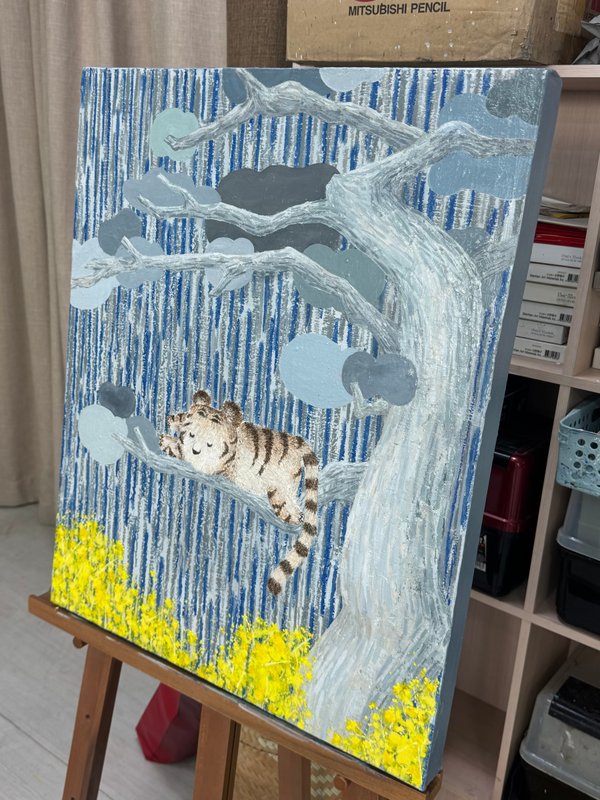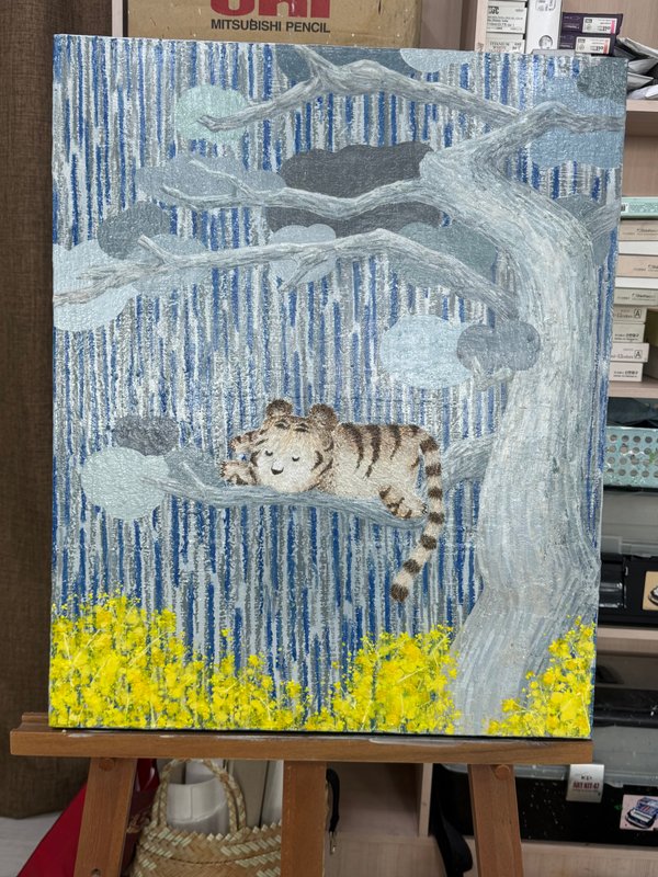 어릴 적 한 번쯤은 아무 걱정 없이 뛰놀던 숲을 기억하시나요? 끝없이 펼쳐진 나뭇잎 사이를 가르고, 이름 모를 꽃과 풀들 사이를 달리던 그 순간을요. 이은희 작가의 작품은 그 숲을 다시 기억할 수 있도록 유도합니다. 자연의 흐름을 따라 무심히 뿌려진 물감, 흘러내리고 겹쳐진 색들은 마치 바람을 따라 흔들리는 풀잎처럼 자유롭습니다. 그 위를 가볍게 뛰노는 아기 호랑이는 우리 마음 깊은 곳에 숨어 있던 천진난만한 자아를 일깨워 줍니다. 작가는 스케치조차 없이 캔버스에 물감을 붓고 문지르며, 자연처럼 예측할 수 없는 흐름을 만들어냅니다. 흔적들이 쌓이고 사라지며 완성된 화면은 어릴 적 우리가 무심히 뛰어다녔던 순간들처럼 자유롭고 솔직합니다. 구상과 추상이 조화롭게 뒤섞여 따뜻한 분위기를 자아내는 이은희 작가의 작품은 우리의 순수함을 떠올리게 합니다. 작품 앞에 잠시 멈춰 서서 작은 호랑이를 따라 숲을 날아다니듯, 마음 한 켠에 여전히 살아 있는 천진함을 만나보세요.