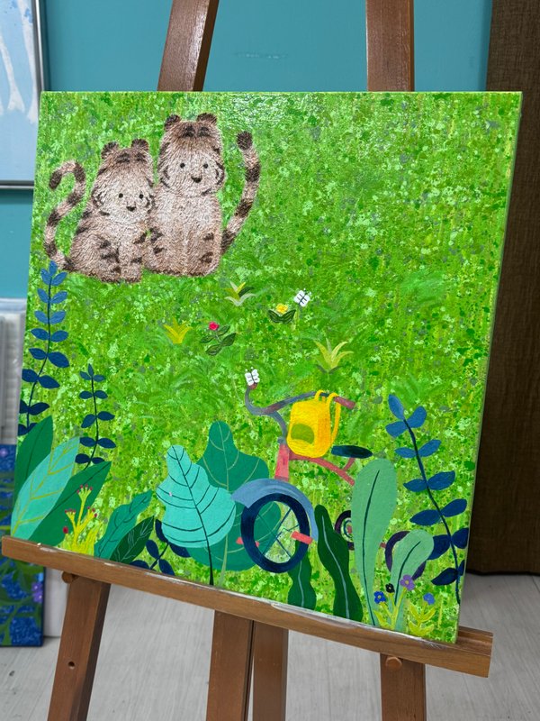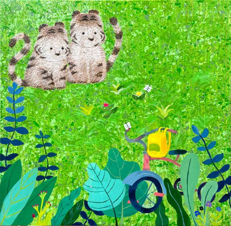 어릴 적 한 번쯤은 아무 걱정 없이 뛰놀던 숲을 기억하시나요? 끝없이 펼쳐진 나뭇잎 사이를 가르고, 이름 모를 꽃과 풀들 사이를 달리던 그 순간을요. 이은희 작가의 작품은 그 숲을 다시 기억할 수 있도록 유도합니다. 자연의 흐름을 따라 무심히 뿌려진 물감, 흘러내리고 겹쳐진 색들은 마치 바람을 따라 흔들리는 풀잎처럼 자유롭습니다. 그 위를 가볍게 뛰노는 아기 호랑이는 우리 마음 깊은 곳에 숨어 있던 천진난만한 자아를 일깨워 줍니다. 작가는 스케치조차 없이 캔버스에 물감을 붓고 문지르며, 자연처럼 예측할 수 없는 흐름을 만들어냅니다. 흔적들이 쌓이고 사라지며 완성된 화면은 어릴 적 우리가 무심히 뛰어다녔던 순간들처럼 자유롭고 솔직합니다. 구상과 추상이 조화롭게 뒤섞여 따뜻한 분위기를 자아내는 이은희 작가의 작품은 우리의 순수함을 떠올리게 합니다. 작품 앞에 잠시 멈춰 서서 작은 호랑이를 따라 숲을 날아다니듯, 마음 한 켠에 여전히 살아 있는 천진함을 만나보세요.