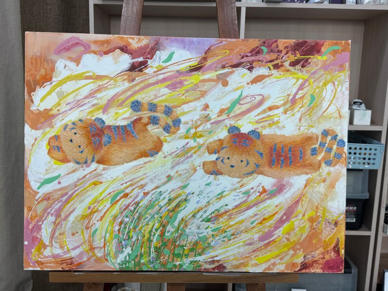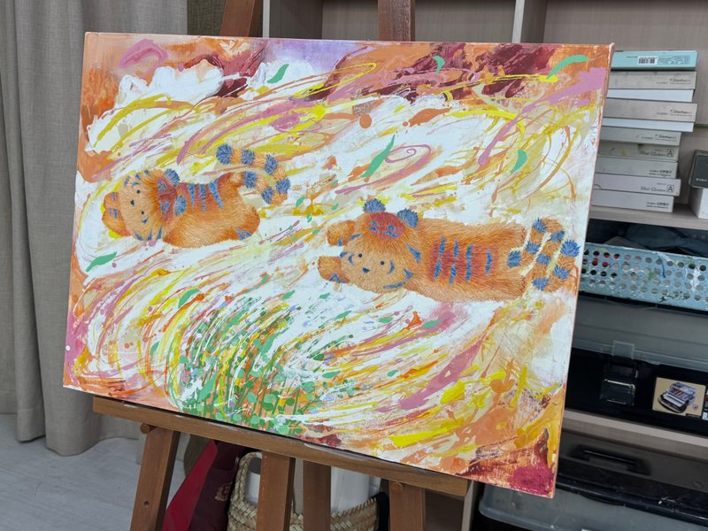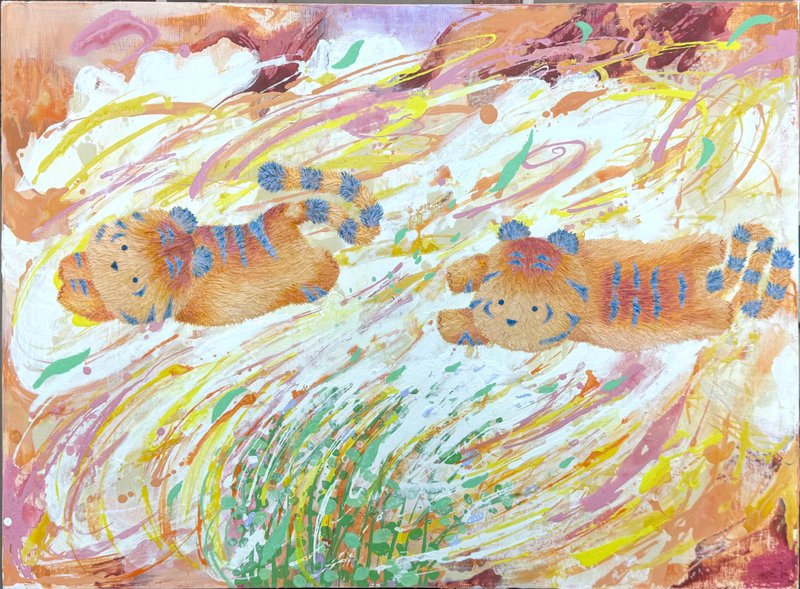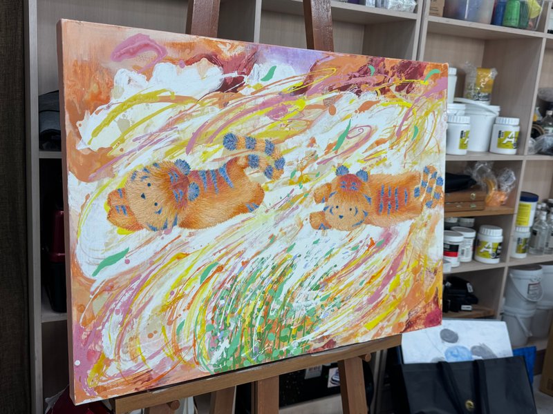 어릴 적 한 번쯤은 아무 걱정 없이 뛰놀던 숲을 기억하시나요? 끝없이 펼쳐진 나뭇잎 사이를 가르고, 이름 모를 꽃과 풀들 사이를 달리던 그 순간을요. 이은희 작가의 작품은 그 숲을 다시 기억할 수 있도록 유도합니다. 자연의 흐름을 따라 무심히 뿌려진 물감, 흘러내리고 겹쳐진 색들은 마치 바람을 따라 흔들리는 풀잎처럼 자유롭습니다. 그 위를 가볍게 뛰노는 아기 호랑이는 우리 마음 깊은 곳에 숨어 있던 천진난만한 자아를 일깨워 줍니다. 작가는 스케치조차 없이 캔버스에 물감을 붓고 문지르며, 자연처럼 예측할 수 없는 흐름을 만들어냅니다. 흔적들이 쌓이고 사라지며 완성된 화면은 어릴 적 우리가 무심히 뛰어다녔던 순간들처럼 자유롭고 솔직합니다. 구상과 추상이 조화롭게 뒤섞여 따뜻한 분위기를 자아내는 이은희 작가의 작품은 우리의 순수함을 떠올리게 합니다. 작품 앞에 잠시 멈춰 서서 작은 호랑이를 따라 숲을 날아다니듯, 마음 한 켠에 여전히 살아 있는 천진함을 만나보세요.