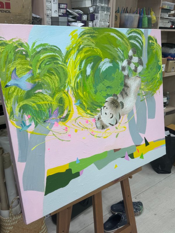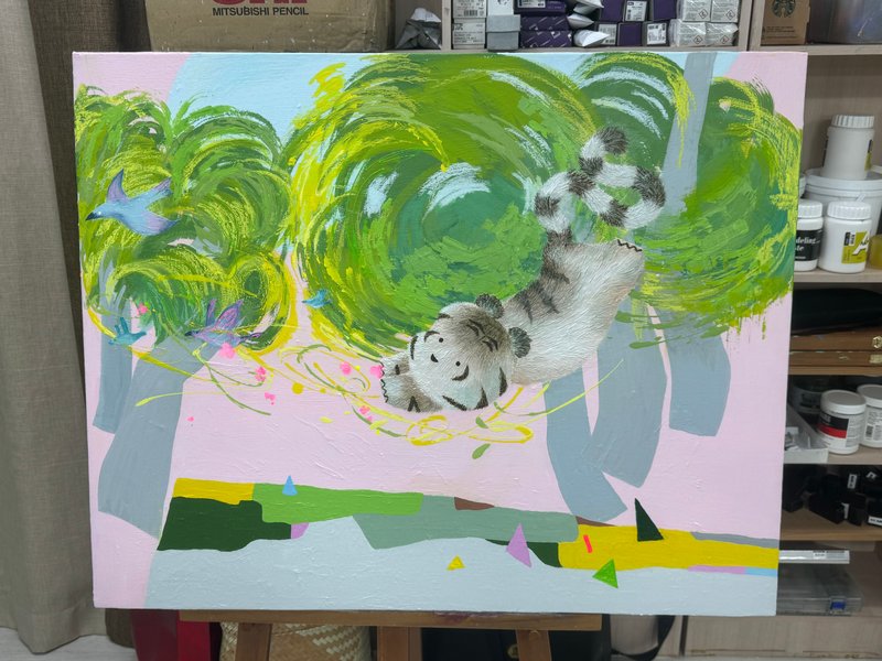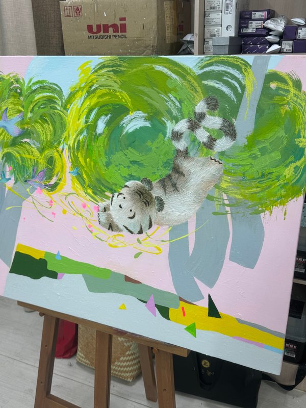 어릴 적 한 번쯤은 아무 걱정 없이 뛰놀던 숲을 기억하시나요? 끝없이 펼쳐진 나뭇잎 사이를 가르고, 이름 모를 꽃과 풀들 사이를 달리던 그 순간을요. 이은희 작가의 작품은 그 숲을 다시 기억할 수 있도록 유도합니다. 자연의 흐름을 따라 무심히 뿌려진 물감, 흘러내리고 겹쳐진 색들은 마치 바람을 따라 흔들리는 풀잎처럼 자유롭습니다. 그 위를 가볍게 뛰노는 아기 호랑이는 우리 마음 깊은 곳에 숨어 있던 천진난만한 자아를 일깨워 줍니다. 작가는 스케치조차 없이 캔버스에 물감을 붓고 문지르며, 자연처럼 예측할 수 없는 흐름을 만들어냅니다. 흔적들이 쌓이고 사라지며 완성된 화면은 어릴 적 우리가 무심히 뛰어다녔던 순간들처럼 자유롭고 솔직합니다. 구상과 추상이 조화롭게 뒤섞여 따뜻한 분위기를 자아내는 이은희 작가의 작품은 우리의 순수함을 떠올리게 합니다. 작품 앞에 잠시 멈춰 서서 작은 호랑이를 따라 숲을 날아다니듯, 마음 한 켠에 여전히 살아 있는 천진함을 만나보세요.