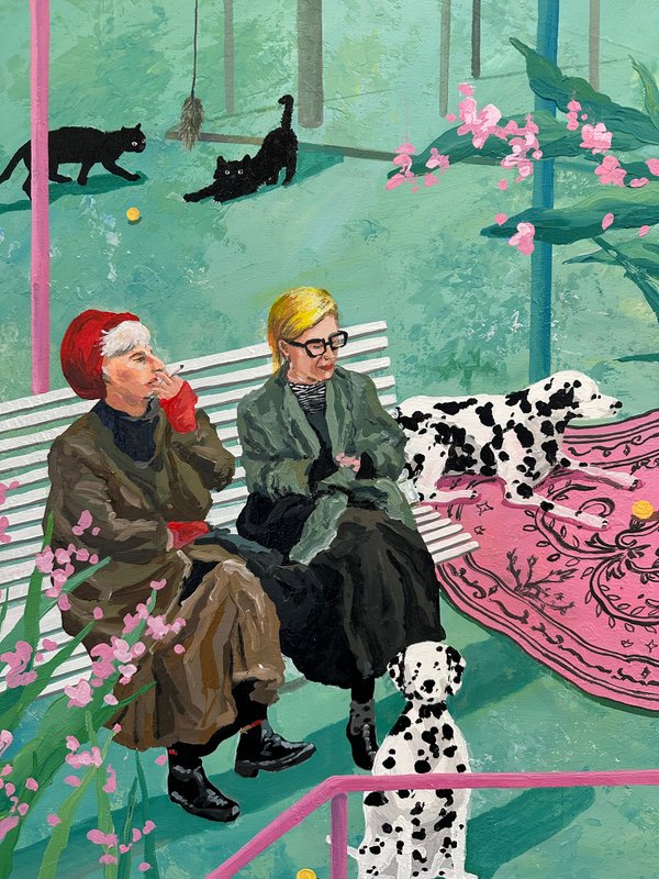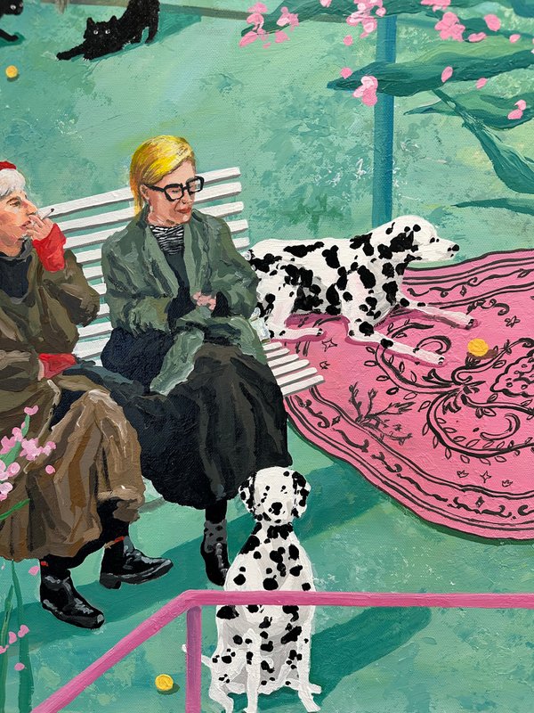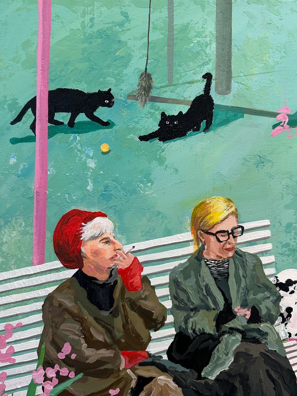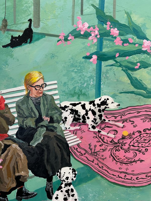 달콤한 색이 화면을 가득 채웁니다. 이소 작가의 캐릭터들은 디저트처럼 부드럽고, 동화처럼 다정합니다. 화면 아래에는 다양한 이야기들이 층층이 쌓여 있습니다. 어떤 날의 웃음, 어떤 밤의 위로 등 조금은 쓸쓸하지만 너무나 포근한 감정의 결과도 같이 말입니다. 작가는 일상의 경험을 작은 캐릭터 안에 숨겨 놓습니다. 그리고 그것을 아크릴, 오일, 모델링 페이스트 같은 다양한 재료로 다시 짜맞추는 과정을 통해서 질감은 고르고 다채로워지며, 자유로운 색의 표현을 보여주게 됩니다. 작가의 그림은 작고 사소한 장면들을 품고 있습니다. 그러나 그 속에는 감동과 따뜻한 이야기들이 함께 어우러지며 잔잔하고 단단한 감정을 불러일으키게 됩니다. 다른 작품에서는 노인이 등장하기도 하는데요, 면 분할된 배경은 공간을 열고, 노인은 미소로 그 공간을 채우며 쓸쓸함과 편안함이 나란히 공존합니다. 다양한 감정을 느낄 수 있게 해주는 이소 작가의 작품을 같이 관람해 보는 것은 어떨까요?