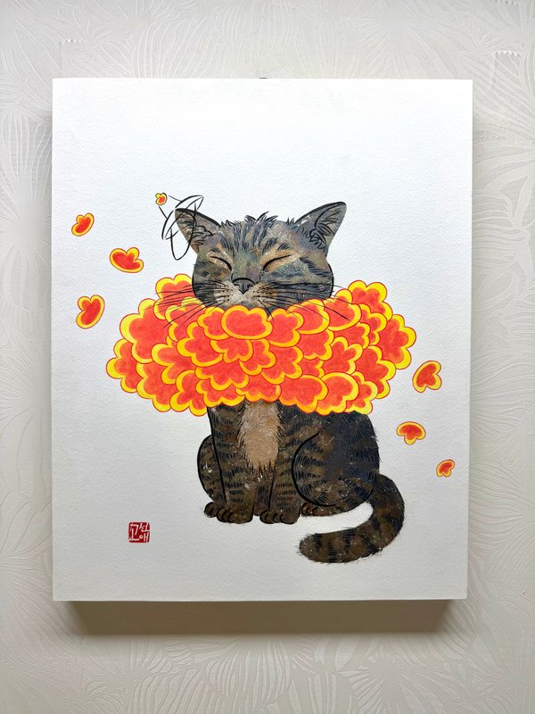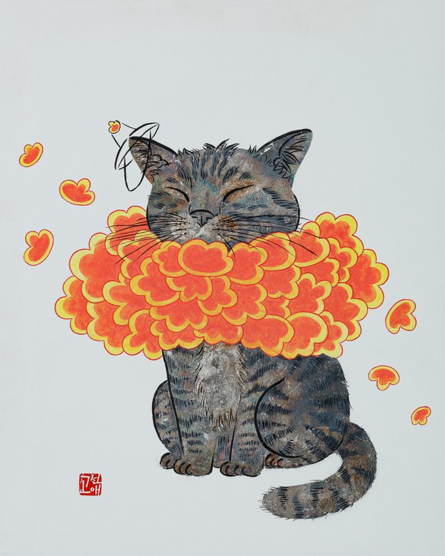 작품을 바라보고 있으면 마치 고양이 한 마리가 다가와 조용히 곁에 앉는 듯한 느낌을 받습니다. 작품 속 고양이들의 초롱초롱하고 다정한 시선, 민화의 부드러운 곡선과 화려한 색감이 한데 어우러져 우리에게 따뜻한 온기를 전해주고 자연스러운 미소를 머금게 만듭니다. 작가의 작품은 전통 민화에서 등장하는 고양이의 재현을 넘어 우리의 삶과 함께하는 가족이자 친구로 다가오게 만듭니다. 작품을 감상하다 보면, 사랑하는 반려동물과 함께한 순간들이 떠오르거나, 어딘가에서 한가로이 낮잠을 즐기고 있을 고양이의 모습이 그려집니다. 고선애 작가의 작품을 통해 따뜻한 기억과 감정을 느끼며 잊고 있던 소소한 행복을 다시금 떠올려 보기를 바랍니다.