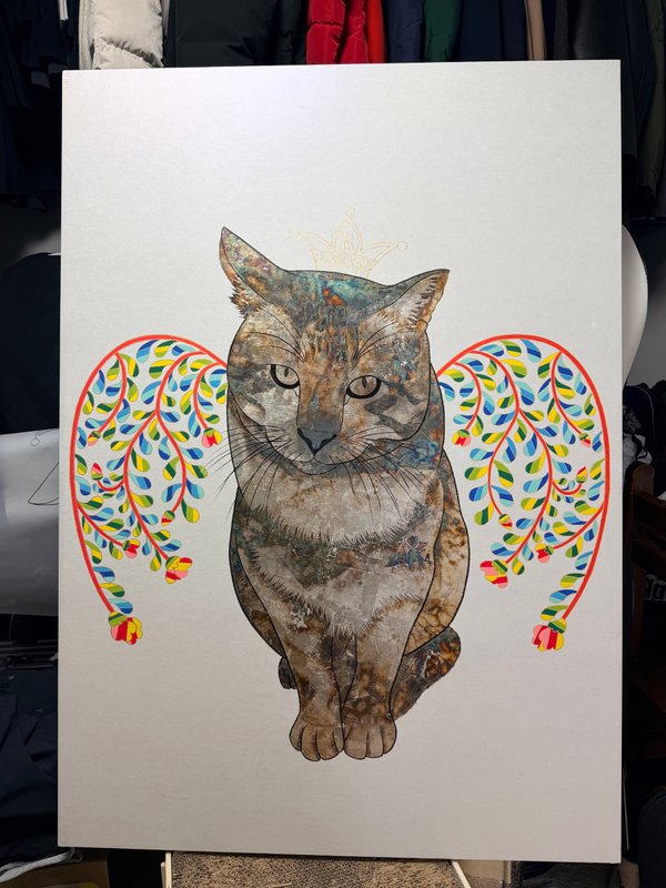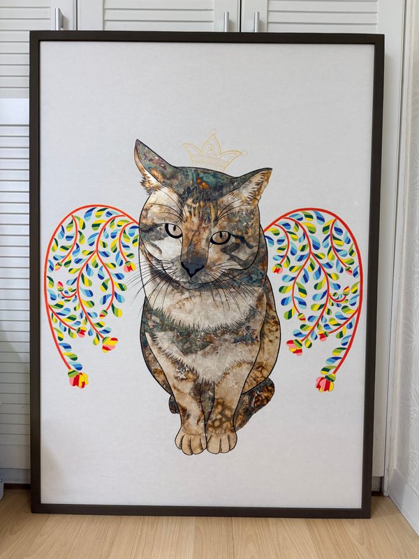 작품을 바라보고 있으면 마치 고양이 한 마리가 다가와 조용히 곁에 앉는 듯한 느낌을 받습니다. 작품 속 고양이들의 초롱초롱하고 다정한 시선, 민화의 부드러운 곡선과 화려한 색감이 한데 어우러져 우리에게 따뜻한 온기를 전해주고 자연스러운 미소를 머금게 만듭니다. 작가의 작품은 전통 민화에서 등장하는 고양이의 재현을 넘어 우리의 삶과 함께하는 가족이자 친구로 다가오게 만듭니다. 작품을 감상하다 보면, 사랑하는 반려동물과 함께한 순간들이 떠오르거나, 어딘가에서 한가로이 낮잠을 즐기고 있을 고양이의 모습이 그려집니다. 고선애 작가의 작품을 통해 따뜻한 기억과 감정을 느끼며 잊고 있던 소소한 행복을 다시금 떠올려 보기를 바랍니다.