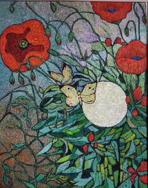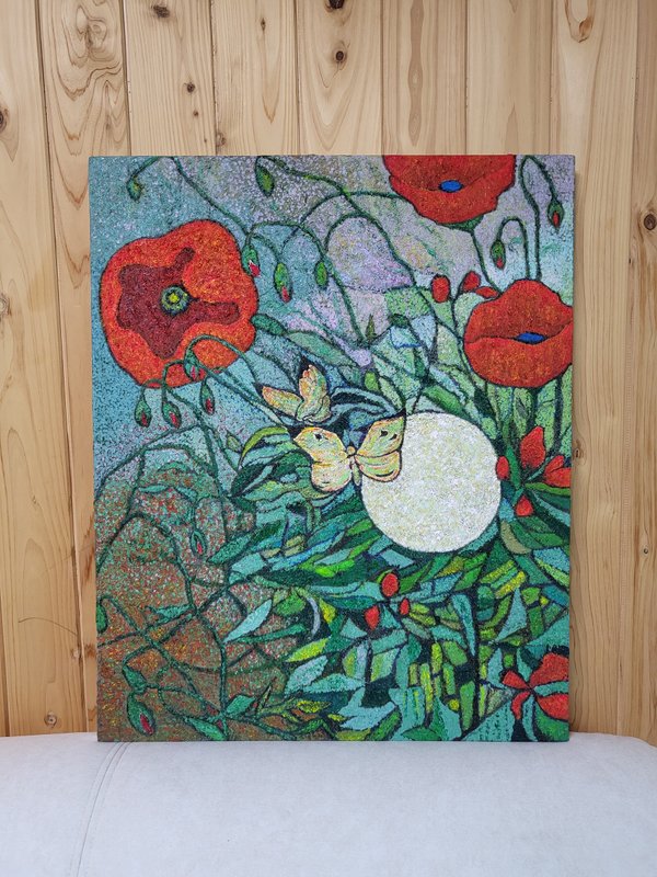 작품은 우주와 자연을 연결하고자 하는 독특한 시각을 제공합니다. 다양한 색감과 패턴으로 표현된 작가의 작품은 때로는 강렬하게 표현되며, 때로는 조화롭게 표현됩니다. 작품의 표현 방식인 점 찍기는 반복적인 과정에서 우주적 의미를 찾아가려는 작가의 노력을 의미합니다. 또한 분절된 점에서 시작하여 작가는 전체를 연결하고자 합니다. 이러한 행위적 방식으로 인하여 관람자는 자연의 가치를 되새기고, 우주와 자연이 서로 얽히고 연결된 특별한 인연을 느낄 수 있습니다. 작품을 통해 자연과 인간, 우주와의 관계를 성찰하고 그 깊은 의미를 느끼며 평온감과 경외감을 경험하시길 바랍니다.