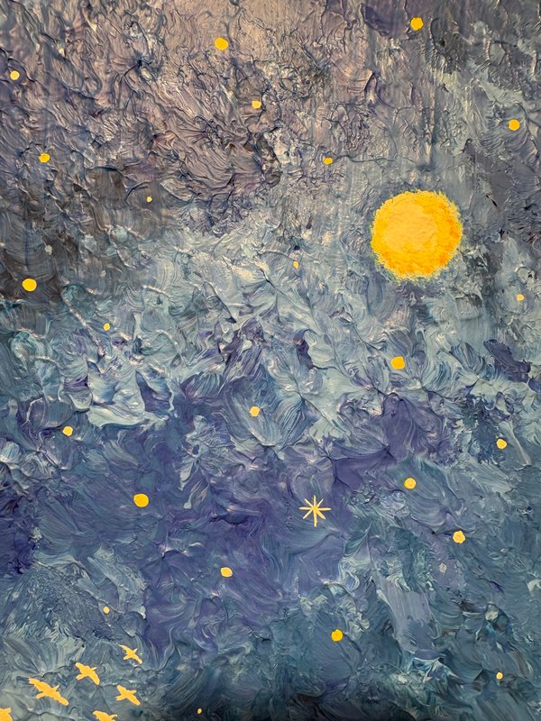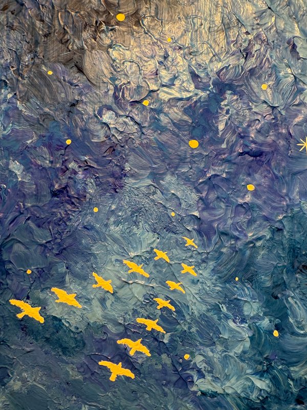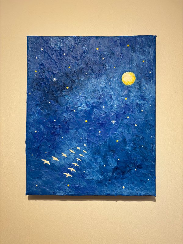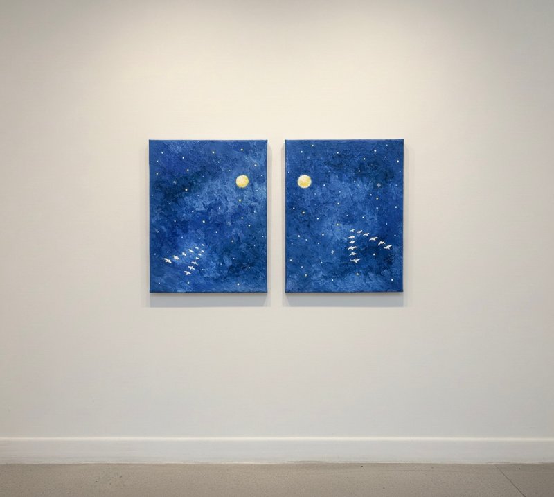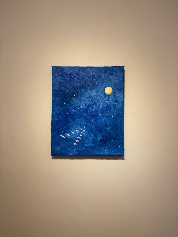 작품 속 깊고 푸른 밤하늘을 유유히 날아가는 철새들은 자유와 동경, 희망과 추억을 상징합니다. 하늘에 떠 있는 별들은 단순한 천체가 아니라, 우리의 기억과 감정이 머무는 특별한 장소로 다가옵니다. 이 작품을 마주한 우리는 어린 시절 밤하늘을 올려다보며 느꼈던 감동, 별자리에 담긴 호기심과 상상, 그리고 별빛 아래에서 시작된 운명 같은 인연들을 떠올릴 수 있습니다. 작가는 이처럼 개인의 기억과 감성을 조용히 두드리며, 보는 이가 자신만의 이야기를 떠올릴 수 있는 여운을 남깁니다. 자신만의 감성으로 작품을 해석해 보고 싶은 분들에게 이 작품을 추천합니다. 하늘을 나는 철새처럼, 별빛을 따라 당신의 기억도 아름답게 날아가기를.