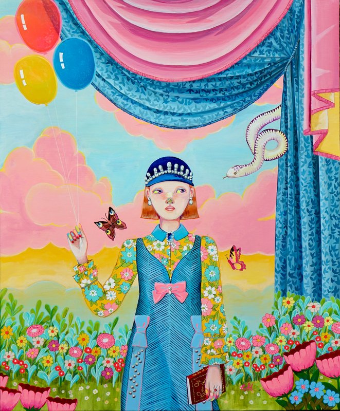 꾸띠리에홀리데이 작가의 그림은 "가장 빛나는 순간을 찾아 떠나는 한 소녀의 여정"을 그린 이야기로, 사춘기 딸을 바라보며 느낀 애틋한 감정에서 비롯되었다. 작품은 소녀의 성장과 내면의 방황을 사랑과 이해로 풀어내며, 초현실적이고 몽환적인 풍경 속에서 펼쳐진다. 작가는 ‘입체적인 기법’을 사용해 빛과 색을 강조하고, 아크릴 위에 글라스 페인트와 글리터 글루를 더하여 ‘빛의 반사와 반짝임’을 표현한다. 이는 소녀가 내면의 무지갯빛 자아를 발견하는 순간을 시각적으로 암시한다. 작품 속 소녀의 의상은 작가의 패션 디자이너 경험을 바탕으로 디자인되어, 소녀의 내면적 변화를 색상과 패턴을 사용해 상징적으로 나타낸다. 작가는 마르틴 하이데거의 ‘죽음 앞에 미리 달려가기’ 개념을 차용하지만, 소녀의 여정은 죽음이 아닌 자기 자신을 미리 발견하는 과정임을 보여주고. 방황과 갈등 속에서도 자기 자신을 사랑하는 과정에서 이미 해피엔딩이 이루어졌음을 시사한다. 엄마의 사랑을 시작으로, 내면의 빛을 발견하는 모든 이들에게 보내는 따뜻한 응원의 메시지를 전한다.
