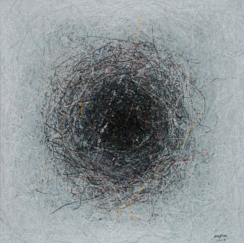 우리는 매일 타인과 관계를 맺으며 공존하고, 서로의 다름을 이해하며 함께 성장해 나갑니다. 김지원 작가의 작품 속 무수한 선과 점은 우리의 상호작용과 관계를 의미하며, 서로 무리를 이루어 질서를 의미하는 면을 이루어 냅니다. 점, 선, 면이 어우러져 화면을 이루는 과정은 우리가 살아가는 세상과 닮아 있으며, 각기 다른 존재들이 만나 만들어내는 변화와 가능성을 상징합니다. 특히, 작가는 물감이 묻은 실을 끌어 올리고 튕겨내는 행위를 통해 상호작용의 흔적을 시각적으로 형상화합니다. 실이 남긴 궤적들은 관계 속에서 쌓이는 기억과 감정을 보여주며, 이는 단순한 연결을 넘어 조화로운 상생을 의미합니다. 작가는 공존이란 단순한 병존이 아니라, 균형을 이루며 새로운 가능성을 수용하는 유연성이라고 말합니다. 그의 작품을 통해 우리는 무질서 속에서도 질서를 찾아가며, 관계 속에서 성장하는 인간의 모습을 발견하게 됩니다.