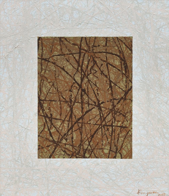 우리는 매일 타인과 관계를 맺으며 공존하고, 서로의 다름을 이해하며 함께 성장해 나갑니다. 김지원 작가의 작품 속 무수한 선과 점은 우리의 상호작용과 관계를 의미하며, 서로 무리를 이루어 질서를 의미하는 면을 이루어 냅니다. 점, 선, 면이 어우러져 화면을 이루는 과정은 우리가 살아가는 세상과 닮아 있으며, 각기 다른 존재들이 만나 만들어내는 변화와 가능성을 상징합니다. 특히, 작가는 물감이 묻은 실을 끌어 올리고 튕겨내는 행위를 통해 상호작용의 흔적을 시각적으로 형상화합니다. 실이 남긴 궤적들은 관계 속에서 쌓이는 기억과 감정을 보여주며, 이는 단순한 연결을 넘어 조화로운 상생을 의미합니다. 작가는 공존이란 단순한 병존이 아니라, 균형을 이루며 새로운 가능성을 수용하는 유연성이라고 말합니다. 그의 작품을 통해 우리는 무질서 속에서도 질서를 찾아가며, 관계 속에서 성장하는 인간의 모습을 발견하게 됩니다.