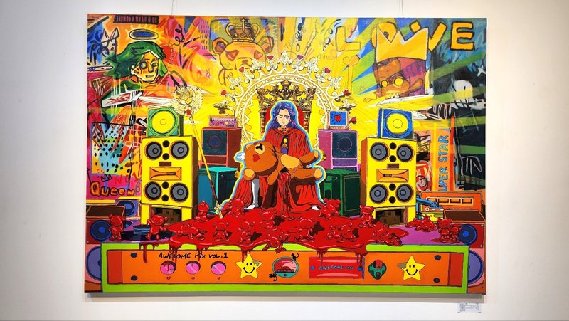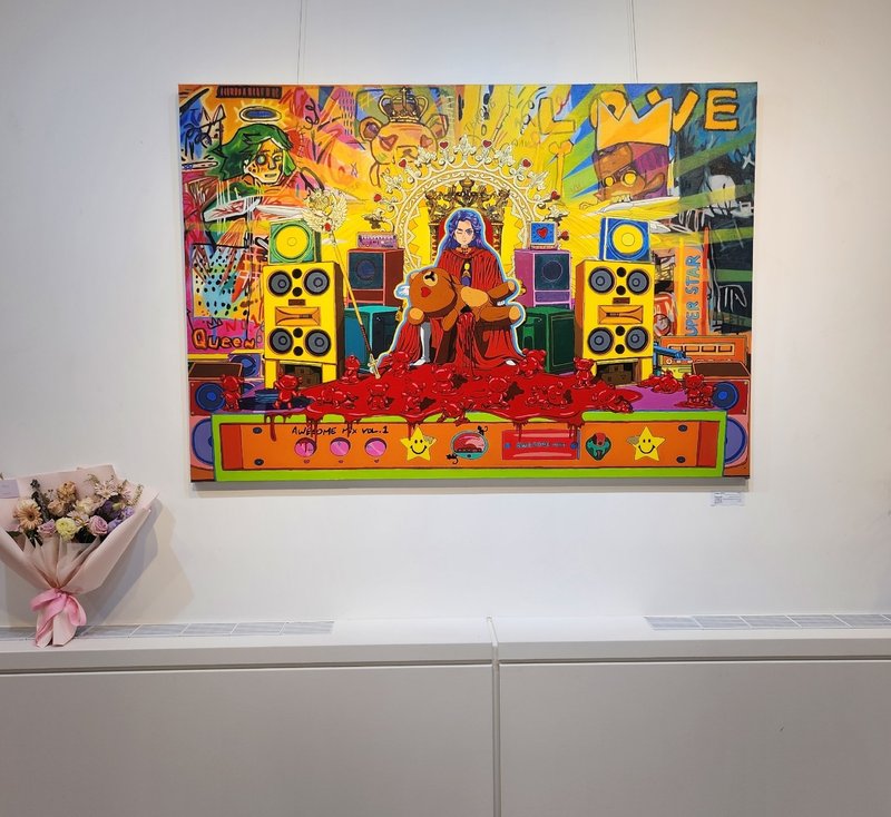 이정화 작가의 그림은 팝적인 요소와 함께 캐릭터의 등장으로 마치 애니메이션의 한 장면과 같은 분위기를 연출합니다. 만화를 연상시키는 표현과 화면에 텍스트가 크게 가로지르기도 하는 등, 갖가지의 재미난 요소들로 관람자들의 흥미를 자극합니다. 그러나, 이정화 작가의 그림은 단순히 즐거움만을 위한 것은 아닙니다. 작가는 자신의 어린 시절 기억의 조각들을 모음과 동시에, 사람이 느끼는 감정에 대해 그림으로 기록하고자 하였습니다. 작가는 감정은 결코 단순하지 않다고 말하며, 기쁨과 슬픔, 기대나 불안 같은 상반된 감정은 서로 맞물리고 대비될 때 더욱 선명해지는 것이라고 보았습니다. 이에 희비가 엇갈리듯 교차하는 감정의 순간을 작가만의 시각으로 포착하게 됩니다. 포착된 감정은 각종 캐릭터들의 머리색에 상징을 담아 화면을 구성함으로써 새롭게 재탄생시켰습니다. 이를 통해 작품을 감상하는 여러분들께서 작품을 단순히 즉각적인 이미지로만 보는 것을 넘어서, 각자만의 소중한 기억을 떠올리고 감정에 몰입해보는 시간을 가지시기를 바라봅니다.