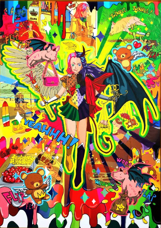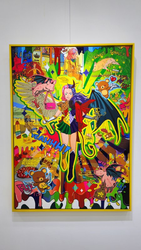 이정화 작가의 그림은 팝적인 요소와 함께 캐릭터의 등장으로 마치 애니메이션의 한 장면과 같은 분위기를 연출합니다. 만화를 연상시키는 표현과 화면에 텍스트가 크게 가로지르기도 하는 등, 갖가지의 재미난 요소들로 관람자들의 흥미를 자극합니다. 그러나, 이정화 작가의 그림은 단순히 즐거움만을 위한 것은 아닙니다. 작가는 자신의 어린 시절 기억의 조각들을 모음과 동시에, 사람이 느끼는 감정에 대해 그림으로 기록하고자 하였습니다. 작가는 감정은 결코 단순하지 않다고 말하며, 기쁨과 슬픔, 기대나 불안 같은 상반된 감정은 서로 맞물리고 대비될 때 더욱 선명해지는 것이라고 보았습니다. 이에 희비가 엇갈리듯 교차하는 감정의 순간을 작가만의 시각으로 포착하게 됩니다. 포착된 감정은 각종 캐릭터들의 머리색에 상징을 담아 화면을 구성함으로써 새롭게 재탄생시켰습니다. 이를 통해 작품을 감상하는 여러분들께서 작품을 단순히 즉각적인 이미지로만 보는 것을 넘어서, 각자만의 소중한 기억을 떠올리고 감정에 몰입해보는 시간을 가지시기를 바라봅니다.