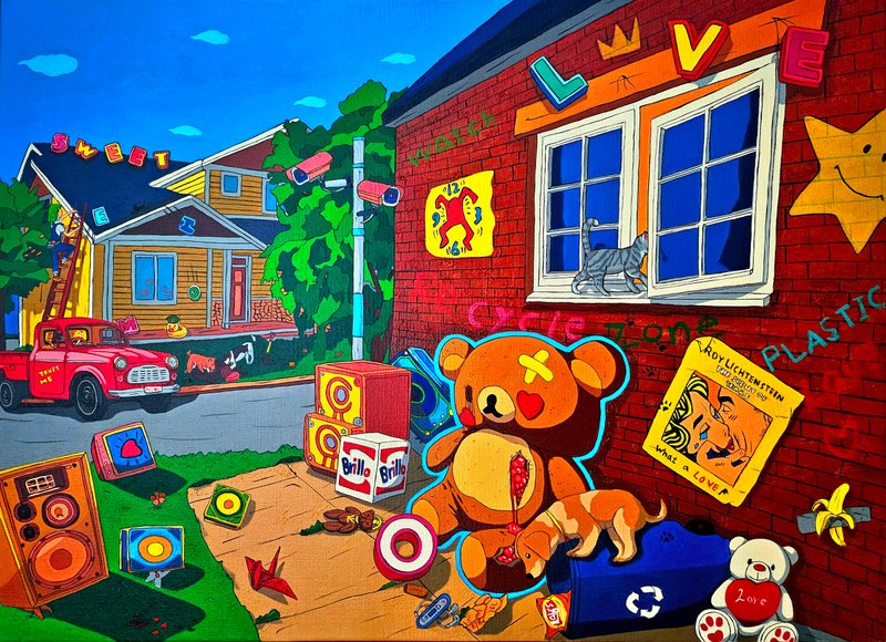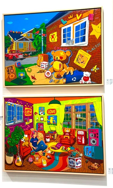 이정화 작가의 그림은 팝적인 요소와 함께 캐릭터의 등장으로 마치 애니메이션의 한 장면과 같은 분위기를 연출합니다. 만화를 연상시키는 표현과 화면에 텍스트가 크게 가로지르기도 하는 등, 갖가지의 재미난 요소들로 관람자들의 흥미를 자극합니다. 그러나, 이정화 작가의 그림은 단순히 즐거움만을 위한 것은 아닙니다. 작가는 자신의 어린 시절 기억의 조각들을 모음과 동시에, 사람이 느끼는 감정에 대해 그림으로 기록하고자 하였습니다. 작가는 감정은 결코 단순하지 않다고 말하며, 기쁨과 슬픔, 기대나 불안 같은 상반된 감정은 서로 맞물리고 대비될 때 더욱 선명해지는 것이라고 보았습니다. 이에 희비가 엇갈리듯 교차하는 감정의 순간을 작가만의 시각으로 포착하게 됩니다. 포착된 감정은 각종 캐릭터들의 머리색에 상징을 담아 화면을 구성함으로써 새롭게 재탄생시켰습니다. 이를 통해 작품을 감상하는 여러분들께서 작품을 단순히 즉각적인 이미지로만 보는 것을 넘어서, 각자만의 소중한 기억을 떠올리고 감정에 몰입해보는 시간을 가지시기를 바라봅니다.