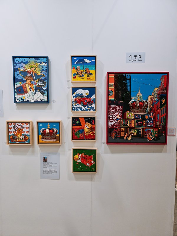 이정화 작가의 그림은 팝적인 요소와 함께 캐릭터의 등장으로 마치 애니메이션의 한 장면과 같은 분위기를 연출합니다. 만화를 연상시키는 표현과 화면에 텍스트가 크게 가로지르기도 하는 등, 갖가지의 재미난 요소들로 관람자들의 흥미를 자극합니다. 그러나, 이정화 작가의 그림은 단순히 즐거움만을 위한 것은 아닙니다. 작가는 자신의 어린 시절 기억의 조각들을 모음과 동시에, 사람이 느끼는 감정에 대해 그림으로 기록하고자 하였습니다. 작가는 감정은 결코 단순하지 않다고 말하며, 기쁨과 슬픔, 기대나 불안 같은 상반된 감정은 서로 맞물리고 대비될 때 더욱 선명해지는 것이라고 보았습니다. 이에 희비가 엇갈리듯 교차하는 감정의 순간을 작가만의 시각으로 포착하게 됩니다. 포착된 감정은 각종 캐릭터들의 머리색에 상징을 담아 화면을 구성함으로써 새롭게 재탄생시켰습니다. 이를 통해 작품을 감상하는 여러분들께서 작품을 단순히 즉각적인 이미지로만 보는 것을 넘어서, 각자만의 소중한 기억을 떠올리고 감정에 몰입해보는 시간을 가지시기를 바라봅니다.