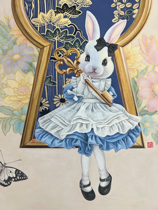 안선주 작가는 전통 민화를 현대적으로 재해석하며, 자신만의 독특한 상상력을 결합해 독창적인 작품 세계를 펼칩니다. 작가의 작품에는 동양과 서양, 전통과 현대라는 상반된 요소들이 조화를 이루며, 이질적이면서도 신선한 예술적 재미를 선사합니다. 특히 작가는 <이상한 나라의 앨리스>를 재해석하여, 더 이상 시계토끼를 기다리지 않는 주체적인 존재인 앨리스를 '앨리스 토끼'로 새롭게 탄생시켰습니다. 이는 스스로의 꿈을 찾아나서는 앨리스의 성장과 자아 발견의 여정을 상징합니다. 또한 책가도, 모란도 등 전통 민화를 현대 일러스트 감성으로 풀어내며, 안선주 작가만의 상상 속 세계를 구축합니다. 이처럼 만날 수 없는 것들의 만남을 통해 관람객에게 무엇이든 표현 가능한 예술의 즐거움을 전하고 있습니다. 지금, 일상에 지친 당신을 무한한 상상의 세계로 초대합니다. 안선주 작가의 작품 속으로, 함께 떠나보실래요?