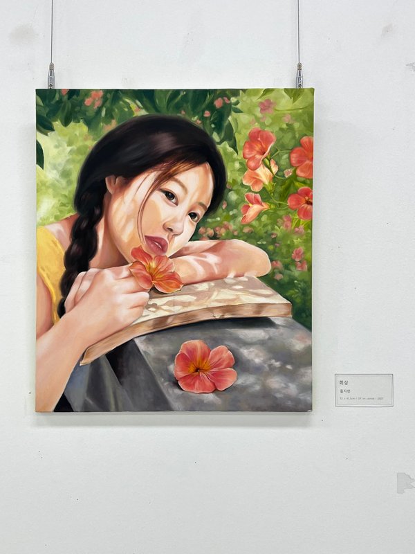 김지인 작가는 삶의 단편적 경험들을 채집하듯 수집하고, 그것을 이미지로 재조합하여 자신만의 감정 세계를 구성해 나갑니다. 화면 속 인물은 고요한 자연과 마주하고, 거울처럼 비친 물속 자아와 눈을 맞추고 있는데요, 이들은 단지 누워있거나 정적인 상태에 있는 것이 아닙니다. 그들은 작가의 내면처럼, 끊임없이 '나'를 응시하고, 나아가 관람자로 하여금 자기 존재를 되묻게 합니다. 작가의 작품은 우리가 외면해 온 진실한 '나'와 마주하게 합니다. 우리 안에는 하나의 확고한 자아가 있는 것이 아니라, 질문하고 흔들리며 다시 되묻는 자아가 있습니다. 철학자 키에르케고르가 말한 것처럼, 실존은 확실한 답이 아닌 끊임없는 선택과 책임의 자리에 서는 일입니다. 김지인 작가의 그림 앞에서, 삶의 정답을 묻기보다 자신에게 가장 정직한 선택은 무엇인가를 질문하며 깊은 사유를 경험해 보시길 바랍니다.