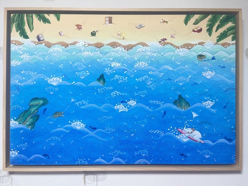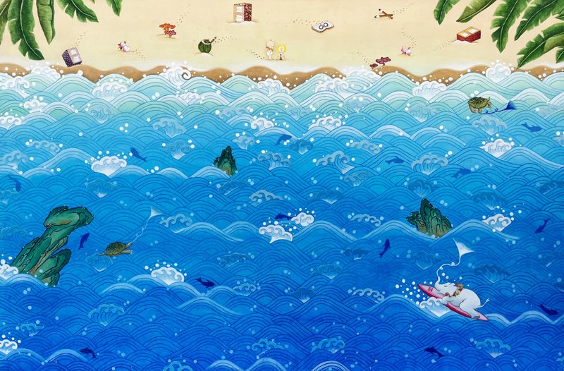 소예 작가는 코끼리와 아이, 꽃신과 복주머니 등 예로부터 행운의 의미가 깃든 대상을 그려냅니다. 이때 단순히 대상을 재현한다기보다는, 코끼리를 모란꽃으로 장식하거나 아기에게 거대한 금수저를 쥐여 주는 등 다양한 소재들을 조합하여 길상의 의미를 확장시킵니다. 작가는 이를 통해, 아무 어려움 없이 수월함을 뜻하는 '탄탄대로(坦坦大路)'의 메시지를 감상자들에게 전달합니다. 따뜻하고 복이 가득한 소예 작가의 작품을 감상하며, 여러분의 앞날에도 평안하고 행운 가득한 복이 깃들길 소망해 보시길 추천 드립니다.
