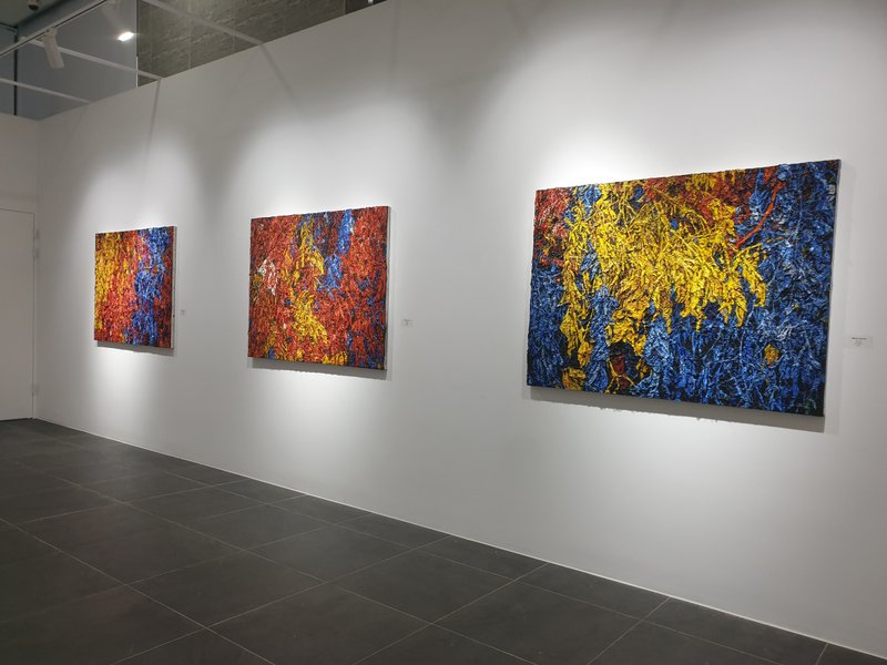 여러분이 떠올리는 '숲'의 이미지는 어떤 모습인가요? 아마 각자 떠올리는 숲의 모습은 모두 다른 풍경일 것입니다. 그만큼 숲은 여러 종의 나뭇가지와 줄기들이 견고하게 얽히고설켜 무수한 형상을 만들어 냅니다. 임호섭 작가는 이러한 자연의 유기적인 관계성을 한 화면에 압축하여 표현합니다. 작가는 작업 초반에 먼저 실을 이용해 화면에 격자무늬를 만들고, 실 위에 무늬가 희미해질 때까지 붓질을 반복합니다. 이때 격자무늬 패턴은 물성을 받쳐주는 뼈대인 동시에, 화면 속 좌표로서 기능하기도 합니다. 그리고 작가가 물감칠을 반복하는 행위는 작품의 물질성을 더 돋보이게 합니다. 이러한 작업 과정을 통해, 임호섭 작가의 화면은 점차 탄탄하고 안정적인 숲으로 변모해 나갑니다. 여러분들도 작가의 작품을 감상하며, 화면 속 생동감 넘치는 자연의 숲을 함께 거닐어 보시길 추천 드립니다.