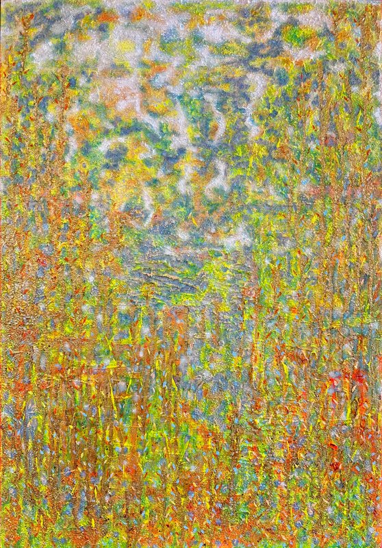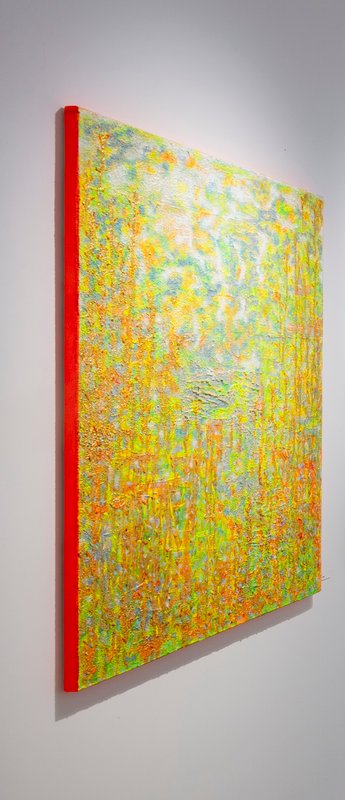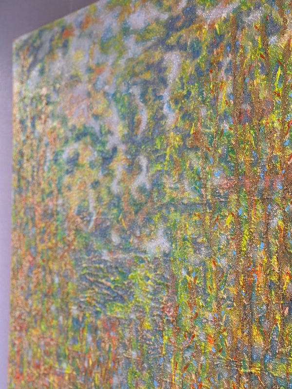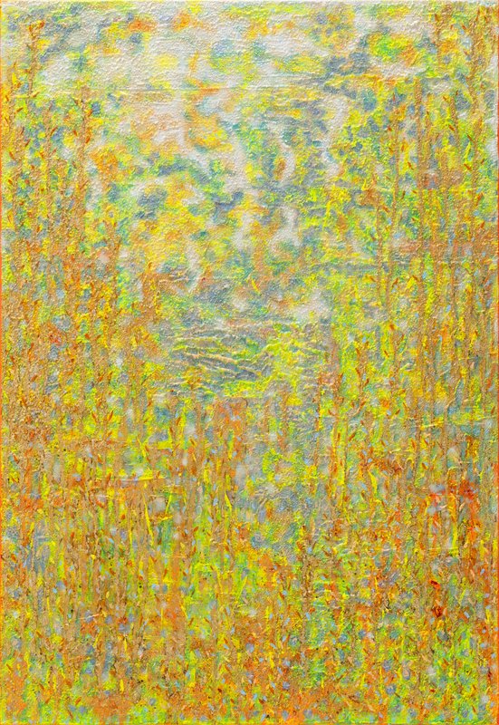 김지혜 작가의 회화는 자연의 흐름과 공기의 움직임, 그리고 그 속에 깃든 생명의 흐름에서 출발한다. 겹겹이 쌓이는 형상과 감정, 찰나의 인상들이 마치 다중 노출된 이미지처럼 마음에 깊이 스며들고, 하나의 시각적 심상으로 응축된다. 작가에게 논과 밭, 시골길, 버려진 땅 위의 들꽃과 풀들. 작가가 사랑하는 이 익숙하고도 소외된 풍경들은 단지 배경이 아닌, 살아 숨 쉬는 거대한 존재이자 작품의 영감이며, 그 생명과 호흡에 자기 감각을 맡긴 채 유영하듯 그림을 그려나간다. 작가의 작업은 형상을 묘사하기보다, 감각의 진동을 따라 색과 움직임의 추상으로 펼쳐진다. 그것은 단순한 시각적 재현이 아니라, 삶과 생명에 대한 깊은 응답이며, 동시에 기도의 행위다. 작업의 모든 과정에는 그의 간절한 기도가 깃들어 있다. 살아있는 존재를 느끼고 보다 나은 생명으로 나아가기 위해, 작가는 그림을 그리고, 그리는 순간순간마다 자신의 존재를 되새긴다.