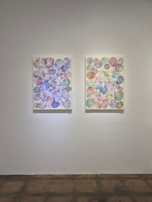 장건영 작가는 한지라는 매체의 물성을 탐구한다. 얇은 한지를 접어 주름을 만들고 안료를 푼 물에 담가 색이 스며들게 한다. 그리고 종이를 건져 말리고 펼치는 일련의 과정을 반복한다. 이때 종이의 굴곡과 결을 따라 안료는 매번 다른 결과를 만들어내고, 작가조차 어떤 형상이 만들어질지 알지 못한다. 완성된 작품은 종이 구김에 따라 규칙적인 도형을 만들어내기도 하며, 뜻밖의 조합을 형성하기도 한다. 이러한 작가의 <Floating> 시리즈는 말 그대로 '부유함'의 상태를 표현한다. 부유한다는 말은 고정된 의미나 완결된 서사로부터 벗어나, 변화에 반응하는 유연한 감각의 상태를 뜻한다. 작가는 오랜 해외 생활을 통해, 익숙했던 관계와 기억들이 흐릿해지는 감각을 몸소 체험했다고 한다. 그래서 조작이 가능한 결과물을 내놓는 작업보단, 불확실함을 포용하며 의도치 않은 시각적 효과를 활용하는 데 집중한다. 변화하는 시간 속 '부유함'이라는 감각이 만들어내는 자연스러운 조형성은 감상자들에게 새로운 시각적 경험을 제공한다.