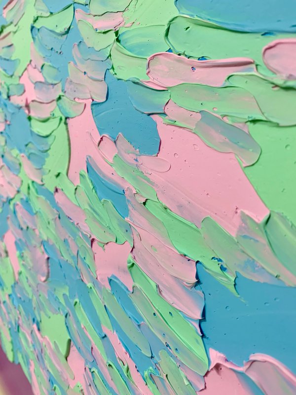 리나 작가는 시각적으로 포착되지 않는 비가시적인 내면의 빛을 시각 언어로 풀어낸다. 주로 캔버스 위에 아크릴 물감을 두텁게 겹쳐 올리는 것이 표현적인 특징이며, 입체감이 느껴지는 마띠에르와 더불어 다양한 색감의 조합을 통해 내면의 감정을 표현한다. 화면 속 흐르는 듯 자연스러운 붓 터치는 마치 바람에 흩날리는 꽃잎과 같기도 하고, 동시에 모래 위를 감싸는 바다의 물살을 연상시키기도 한다. 이때 작가는 회화를 구성하는 중요한 요소 중 하나인 '색채'의 조합을 사용하여, 우리 안에 잠재된 에너지와 내면의 리듬을 형상화한다. 역동성과 고요함이 공존하는 리나 작가의 컬러플한 파동은, 감상자들에게 소리 없이 잔잔한 내면의 울림을 선사한다.