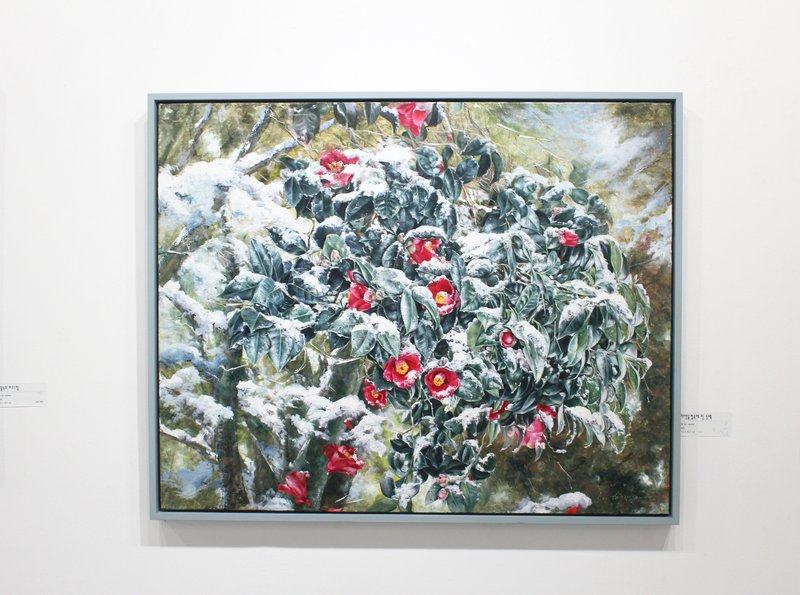 이현주 작가는 주로 동백꽃과 동박새를 화면에 담아낸다. 거센 바람과 눈을 맞으며 긴 겨울을 견디는 동백꽃에 매료된 작가는, 해마다 동백이 피는 곳을 찾아 전국 방방곡곡을 돌아다닌다. 작은 꽃들이 군락을 이루어 서로를 지키고, 추운 계절을 인내하는 동백의 모습은 단순히 아름다운 꽃을 넘어 내면의 강인함마저 느껴진다. 작가는 직접 실견한 동백의 모습을 많은 사람들과 공유하고 싶어 그림을 그리게 되었다고 한다. 작업은 먼저 아크릴로 배경을 겹겹이 쌓아 올린 뒤, 스크래치 기법으로 자연스러운 결을 표현한다. 그리고 여기에 유화 물감으로 동백꽃과 동박새 등을 정성스레 묘사해 나간다. 이때 붉고 강렬한 동백꽃은 다소 차가운 느낌의 배경과 조화를 이루며, 추운 겨울에 피어나는 따뜻한 온기와 같이 강조되고 있다. 그리고 이현주 작가의 작품은 초현실적인 표현과 사실적 구상이 교차한다는 특징을 지닌다. 이는 작가가 '꽃'이라는 소재가 지닌 아름다움, 향기로움과 같은 관습적인 상징을 넘어, 대상의 내면과 본질을 탐구하고 궁극적인 가치를 발견하는 것으로까지 인식이 확장되고 있음을 시사한다.