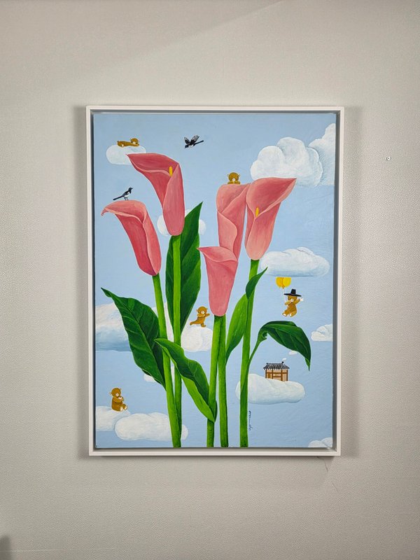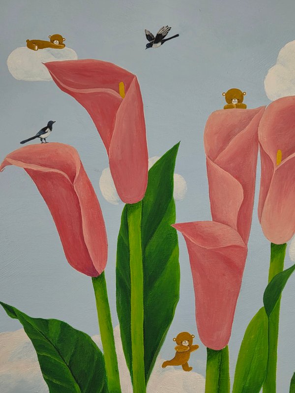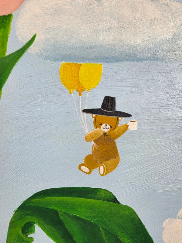 조안나 작가의 작품에는 언제나 눈을 감고 깊이 사색하는 '슬리핑 베어'가 등장한다. 사색이란 무심코 지나쳐왔던 것들을 떠올리는 시간으로, 반복되는 일상에서 삶의 본질을 탐구하게 한다. 여유가 부족한 급변하는 사회에서 현대인들에게 사색은 중요하고도 꼭 필요한 경험이다. 마치 이러한 메시지를 전하듯, 작품 속 슬리핑 베어는 편안하고 어떠한 고민거리도 없어 보이며 그저 서로 기대어 그 순간을 즐기는 듯한 모습입니다. 곰돌이는 캔버스 위 아크릴로 부드럽고 포근한 분위기로 묘사되며, 꽃과 나무 등 주변의 자연물은 편안한 분위기를 고조시킵니다. 아름다운 장면을 넘어 마음속 치유의 공간으로까지 작용하는 작가의 작품은, 현대 사회에서 느끼기 힘든 조용한 사색과 심적 안식의 경험을 제공한다.
