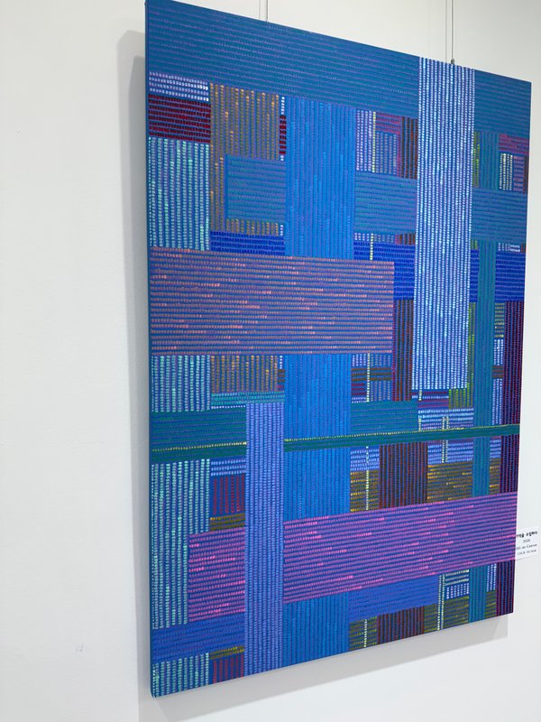 작가는 자연스러운 배열에서 비롯되는 조형성과, 그 조형성이 만들어내는 편안함을 화면에 담아내고자 합니다. 작품 전반을 관통하는 정돈된 리듬은 복잡한 사고를 잠시 내려놓게 하며, 감상자의 시선과 감각을 차분한 상태로 이끕니다. 겉으로는 무용해 보일 수 있는 반복과 간격은 화면 전체의 균형을 형성하는 핵심적인 조형 요소로 작동합니다. 이러한 구조는 특정 지점에 시선을 고정시키기보다 화면 전체를 부드럽게 순환하게 하여, 자연스럽게 긴장이 완화되는 감상 경험을 만들어냅니다. 또한 선을 긋고 지우며 다시 채워 나가는 과정이 화면에 고스란히 남아 있어, 작품은 한 번에 즉각적으로 읽히기보다는 오래 바라볼수록 감정이 정리되는 유형의 회화로 완성됩니다. 작품은 계절의 빛이나 시간대에 따라 화면의 밀도와 여백이 서로 다르게 인식되며, 동일한 공간에서도 매번 다른 표정과 분위기를 형성합니다.