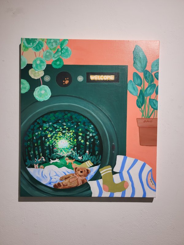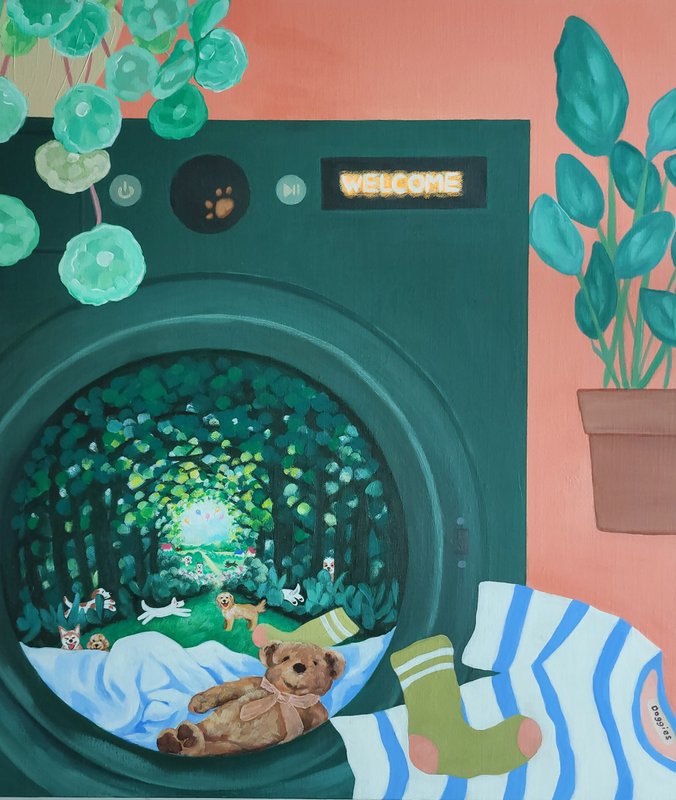 오경자 작가는 반려견 '메이'와 상상 속 동물 친구들을 중심으로 펼쳐지는 따뜻한 풍경을 화폭에 그려낸다. 작가는 잠재된 감정을 꺼내 창작 활동을 통해 곱게 걸러내고, 이를 기반으로 작품에 위로의 정서를 담는다. 그렇기에 작품은 단순한 상상화가 아니라, 자신의 감정을 성찰하고 돌볼 줄 아는 작가의 세심함이 깃든 표현 매체이기도 하다. 반려견의 일상에서 비롯된 순수하고 생명력 넘치는 기운은 작가 특유의 부드럽고 화사한 색감을 통해 화면 전반을 따스하게 물들인다. 마치 동화 속 한 장면과 같은 오경자 작가의 환상적이고 서정적인 작품은, 관람객으로 하여금 유년 시절의 기억과 순수했던 모습들을 다시 불러일으키는 특별한 경험을 제공한다.