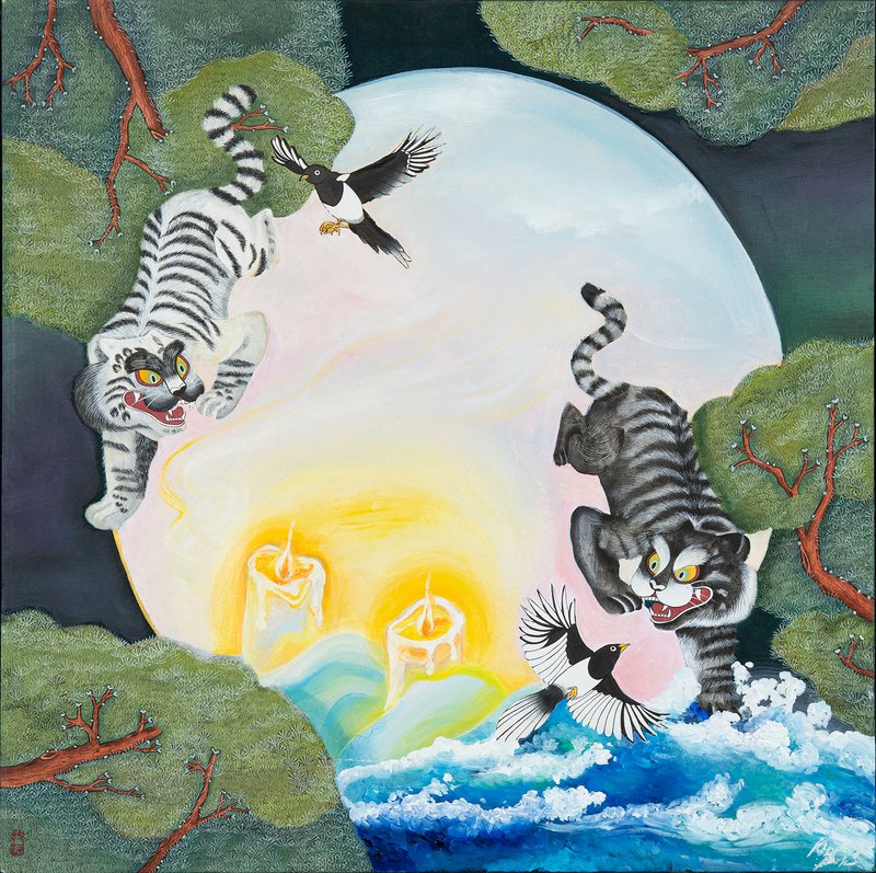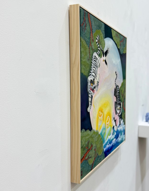 박기량 작가의 작품은 감정을 직접적으로 설명하기보다, 은유적인 이미지와 상징을 통해 조용히 감정을 머물게 합니다. 익숙한 민화의 형식을 따르되, 그 안에 담긴 정서는 지금 우리의 이야기이기에 더 진하게 다가옵니다. 그렇기에 보는 이는 작품을 마주하며 각자의 감정을 투영하고, 때로는 자신도 몰랐던 마음의 결을 발견하게 됩니다. 특히 한 장면 안에서 과거와 현재, 개인과 보편의 시간이 겹쳐지는 방식은 감상의 여운을 길게 남깁니다. 일상에 스며든 작가의 작품을 곁에 두고 오래 바라보는 것을 추천드립니다.