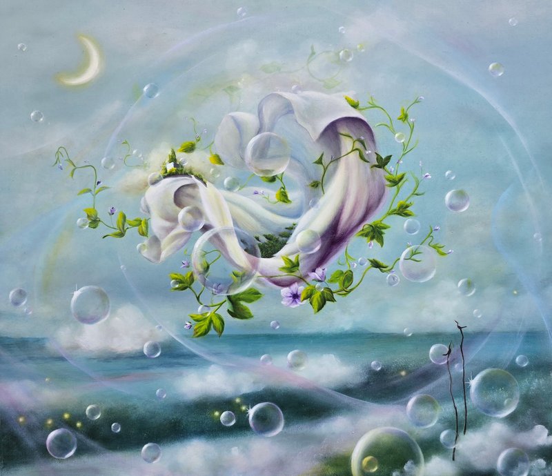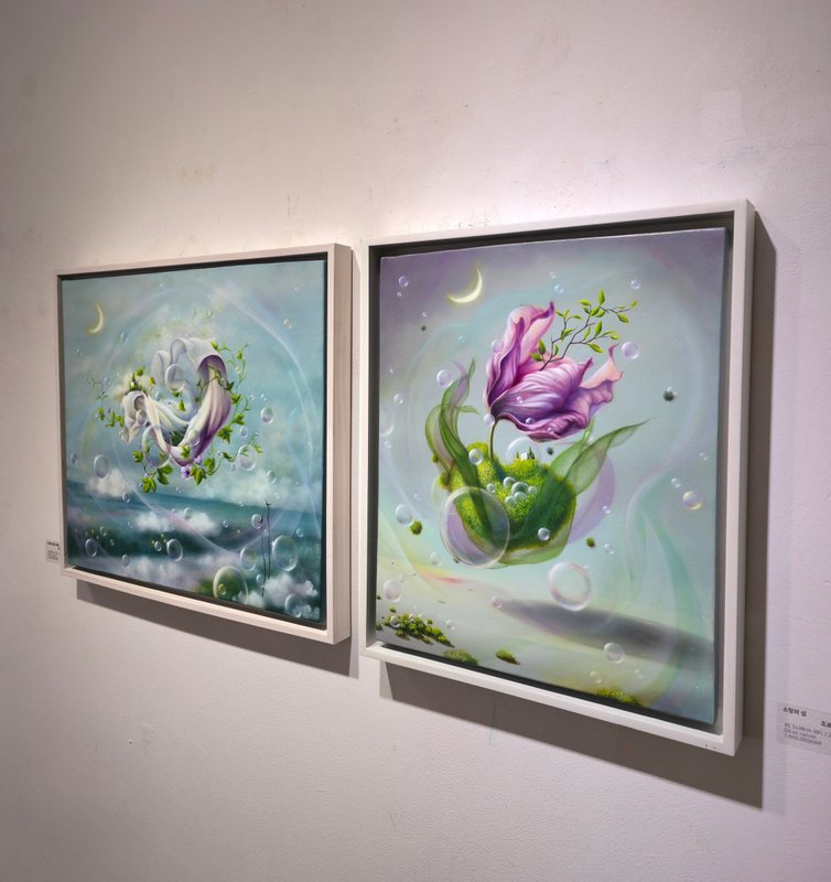 조로사 작가의 작품은 생명의 신비로운 에너지를 '경험할 수 있는 이미지'로 변환하여 관객에게 깊은 시각적 성찰을 선사합니다. 세밀한 묘사와 몽환적인 색채 대비는 현대 미술의 세련된 미감을 잘 보여주며, 작가만의 독창적인 초현실적 세계관은 감상자로 하여금 일상을 벗어난 정서적 해방감을 느끼게 합니다. 이러한 미학적 특징 덕분에 작가의 작품은 차분하면서도 생동감 있는 공간 분위기를 조성하는 데 매우 탁월합니다. 무중력 공간을 부유하는 자연의 조각들은 공간에 개방감과 우아함을 더해주며, 거품과 이끼가 지닌 오묘한 질감은 시각적 풍요로움을 제공합니다. 세련된 인테리어 포인트가 필요한 거실이나 사유의 집중력이 필요한 서재, 혹은 품격 있는 집무실에 배치하기를 추천드립니다.
