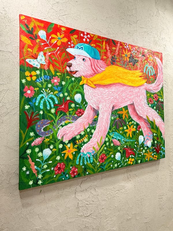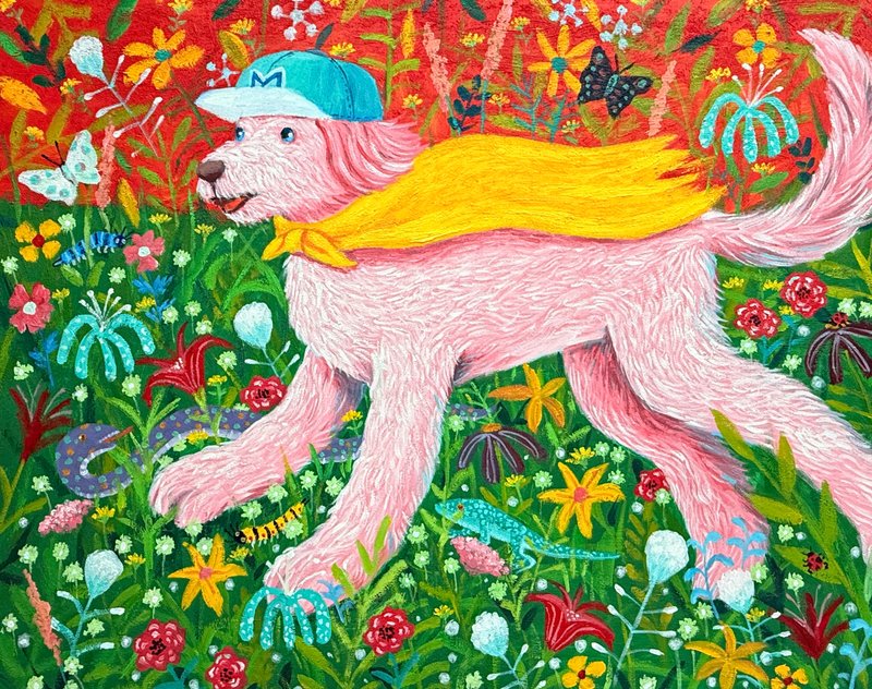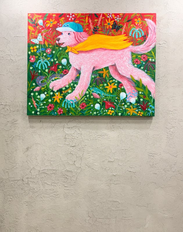 문연화 작가는 서양 명화의 고전적 상징성과 현대 자본주의의 시각문화가 교차하는 지점에서 유쾌한 오마주를 그려낸다. 작가는 르네 마그리트, 에드바르 뭉크, 빈센트 반 고흐와 같은 거장들의 도상을 차용하여, 그 안에 반려견이라는 지극히 사적이고 순수한 존재를 이식했다. 이러한 설정은 인간 중심적 사고에 질문을 던지며, 존재와 욕망 그리고 초월에 대한 새로운 서사를 구축하는 작업의 핵심이다. 작가는 소프트 파스텔이라는 부드러운 매체를 활용해 명화의 중압감을 덜어내고, 그 자리에 반려견의 천진난만함과 현대적 아이콘을 배치함으로써 친숙하면서도 낯선 미감을 선사한다.