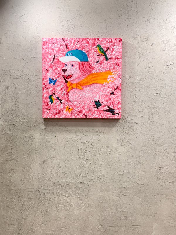 문연화 작가는 서양 명화의 고전적 상징성과 현대 자본주의의 시각문화가 교차하는 지점에서 유쾌한 오마주를 그려낸다. 작가는 르네 마그리트, 에드바르 뭉크, 빈센트 반 고흐와 같은 거장들의 도상을 차용하여, 그 안에 반려견이라는 지극히 사적이고 순수한 존재를 이식했다. 이러한 설정은 인간 중심적 사고에 질문을 던지며, 존재와 욕망 그리고 초월에 대한 새로운 서사를 구축하는 작업의 핵심이다. 작가는 소프트 파스텔이라는 부드러운 매체를 활용해 명화의 중압감을 덜어내고, 그 자리에 반려견의 천진난만함과 현대적 아이콘을 배치함으로써 친숙하면서도 낯선 미감을 선사한다.