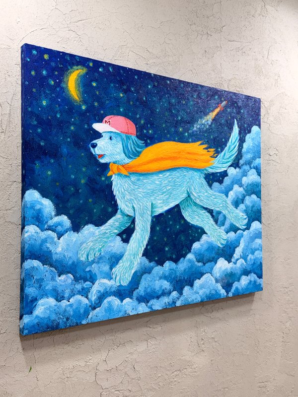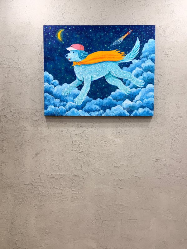 문연화 작가는 서양 명화의 고전적 상징성과 현대 자본주의의 시각문화가 교차하는 지점에서 유쾌한 오마주를 그려낸다. 작가는 르네 마그리트, 에드바르 뭉크, 빈센트 반 고흐와 같은 거장들의 도상을 차용하여, 그 안에 반려견이라는 지극히 사적이고 순수한 존재를 이식했다. 이러한 설정은 인간 중심적 사고에 질문을 던지며, 존재와 욕망 그리고 초월에 대한 새로운 서사를 구축하는 작업의 핵심이다. 작가는 소프트 파스텔이라는 부드러운 매체를 활용해 명화의 중압감을 덜어내고, 그 자리에 반려견의 천진난만함과 현대적 아이콘을 배치함으로써 친숙하면서도 낯선 미감을 선사한다.