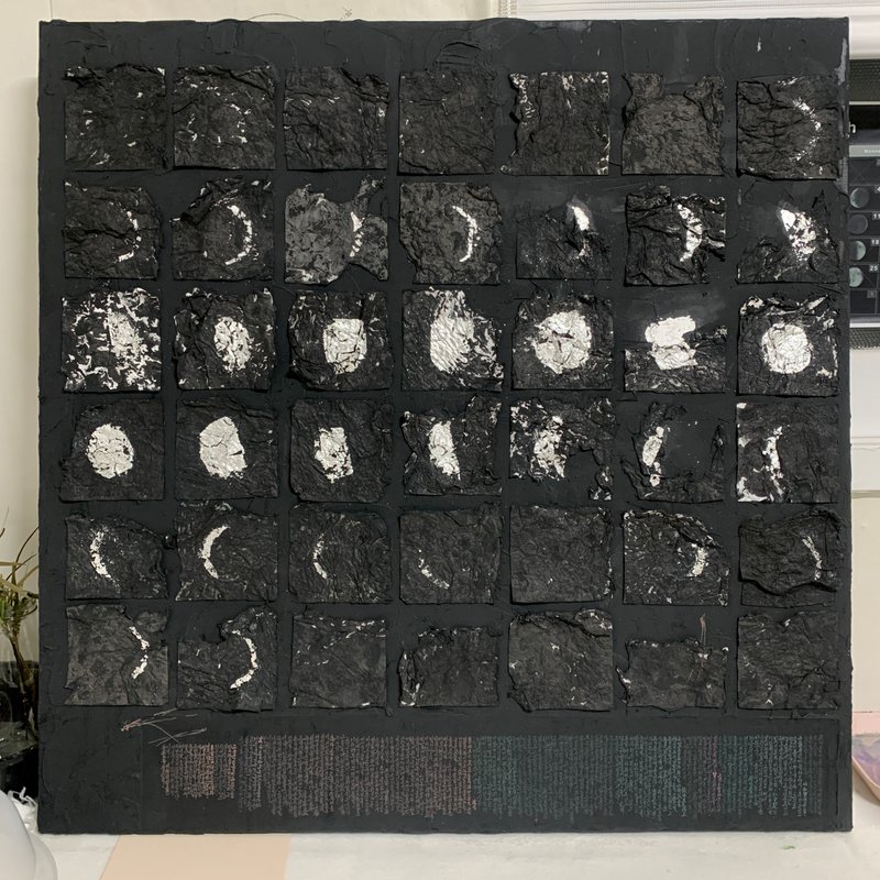 캔버스에 펜, 먹, 혼합 재료, 은박