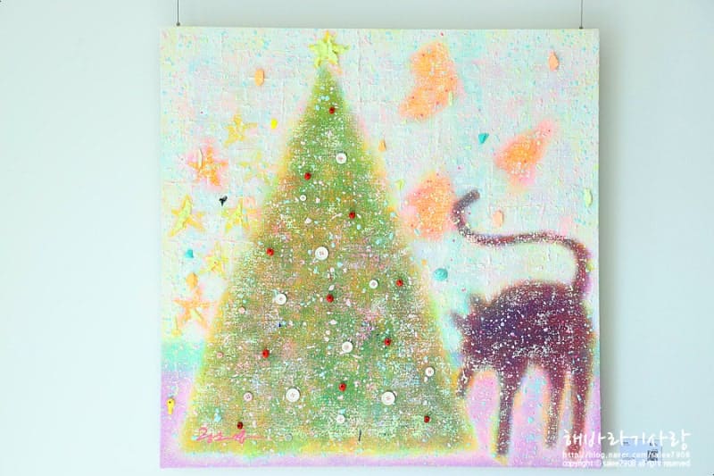 귀여운 고양이와 알록 달록 예쁘게 꾸며진 트리가 벽에 걸리니 간편하게 크리스마스 무드 완성이 되었어요. 너무 과하지 않으면서도 귀여운 트리 작품이 너무나도 예쁘죠?ㅎㅎ