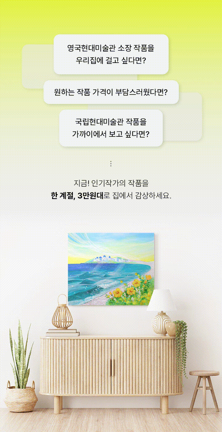 첫 3개월 구독료는 이벤트가로 일시불 결제되며, 이후 일반구독 시 매달 작품 크기에 따른 구독료가 결제됩니다.
