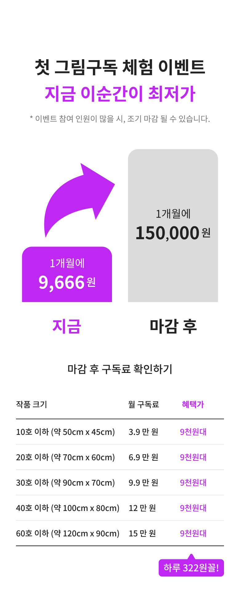 첫 3개월 구독료는 이벤트가로 일시불 결제되며, 이후 일반구독 시 매달 작품 크기에 따른 구독료가 결제됩니다.